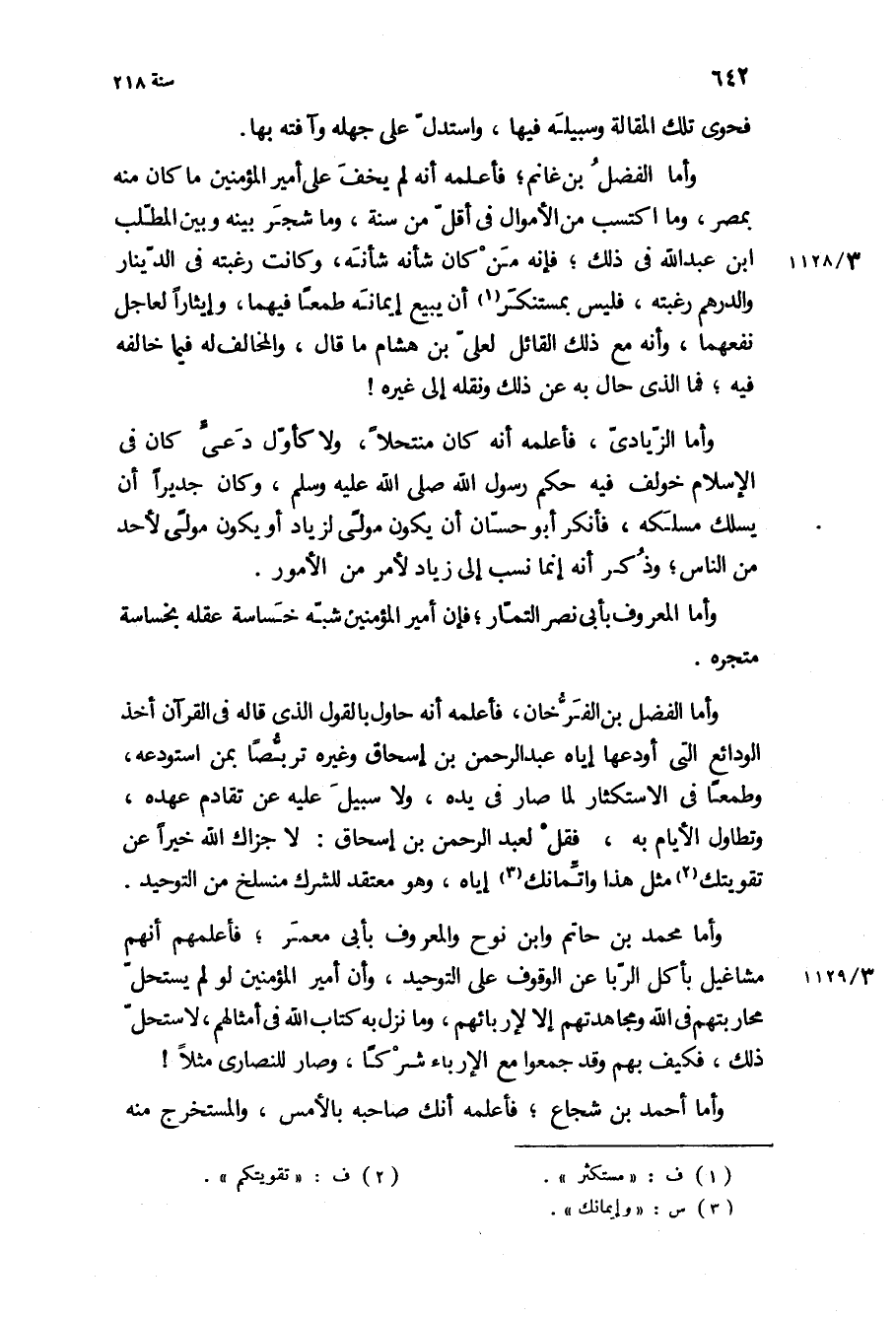 وأما محمد بْن حاتم وابن نوح والمعروف بأبي معمر، فأعلمهم أنهم مشاغيل بأكل الربا عن الوقوف على التوحيد، وأن أمير المؤمنين لو لم يستحل محاربتهم في الله ومجاهدتهم إلا لإربائهم، وما نزل به كتاب الله في أمثالهم، لاستحل ذلك، فكيف بهم وقد جمعوا مع الارباء شركا، وصار للنصارى مثلا! وأما أحمد بْن شجاع، فأعلمه أنك صاحبه بالأمس، والمستخرج منه