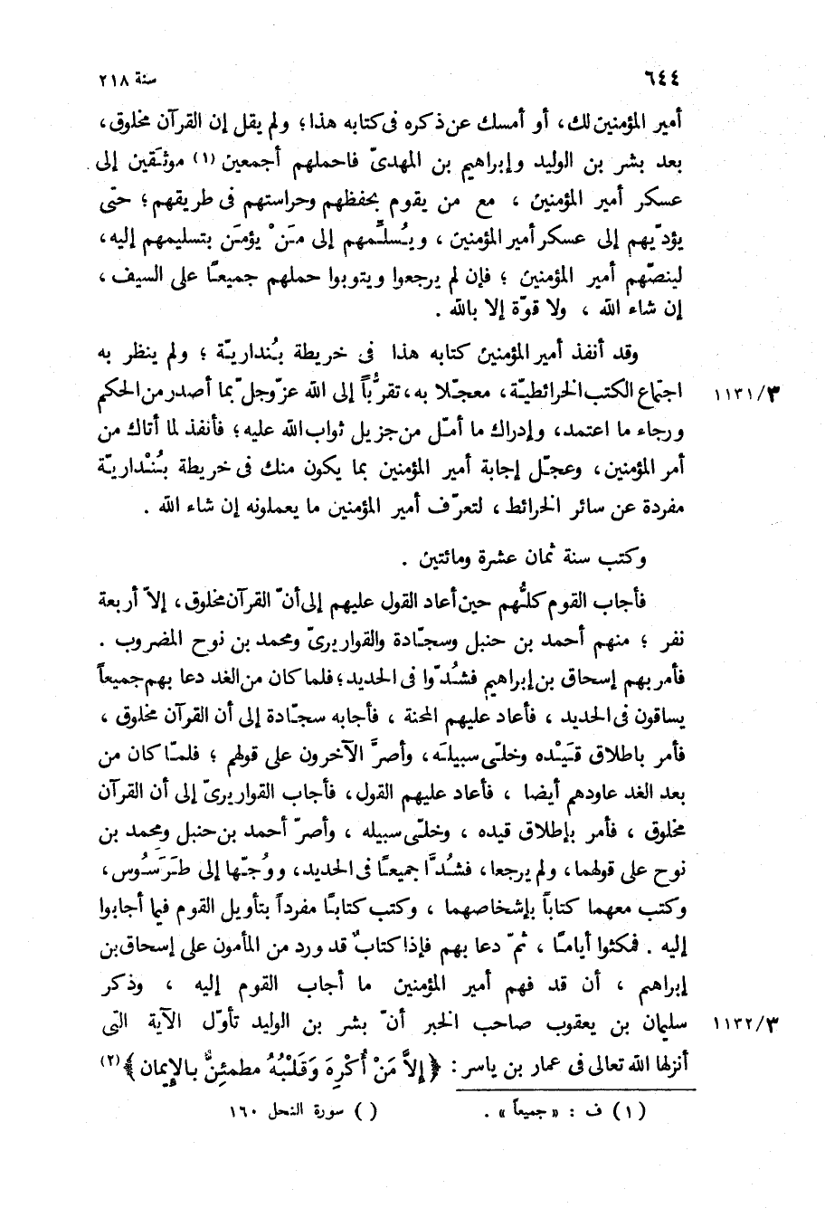 أمير المؤمنين لك، أو أمسك عن ذكره في كتابه هذا، ولم يقل إن القرآن مخلوق، بعد بشر بْن الوليد وإبراهيم بْن المهدي فاحملهم أجمعين موثقين إلى عسكر أمير المؤمنين، مع من يقوم بحفظهم وحراستهم في طريقهم، حتى يؤديهم إلى عسكر أمير المؤمنين، ويسلمهم إلى من يؤمن بتسليمهم إليه، لينصهم أمير المؤمنين، فإن لم يرجعوا ويتوبوا حملهم جميعا على السيف، إن شاء اللَّه، ولا قوة إلا بالله.