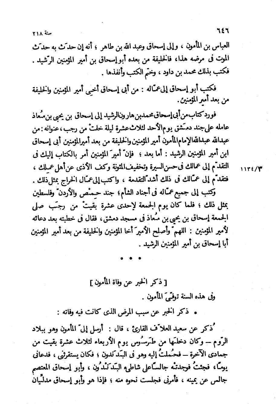 العباس بن المأمون، وإلى إسحاق وعبد الله بْن طاهر، أنه إن حدث به حدث الموت في مرضه هذا، فالخليفة من بعده أبو إسحاق بن أمير المؤمنين الرشيد.