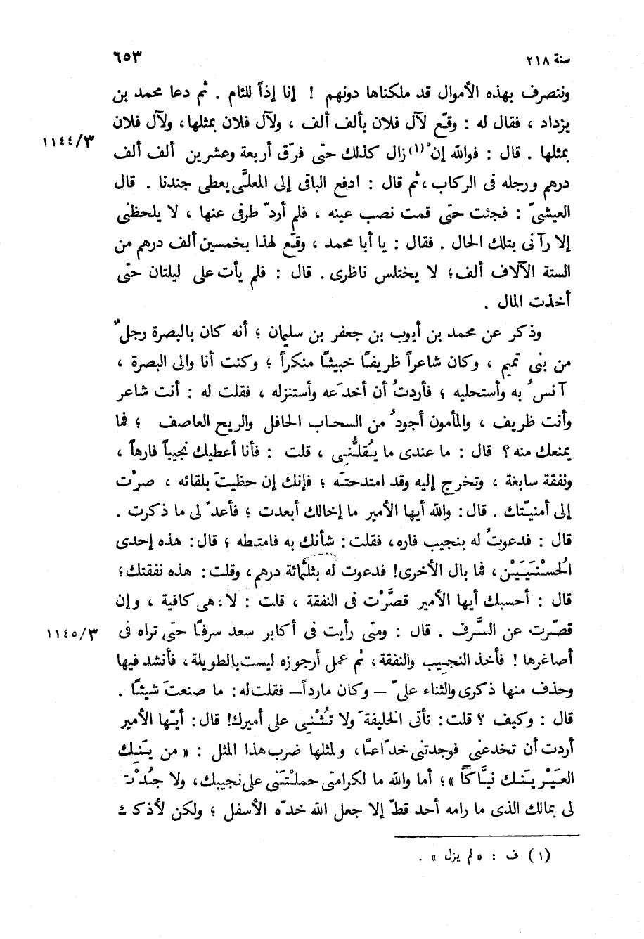 وننصرف بهذه الأموال قد ملكناها دونهم! إنا إذا للئام ثم دعا محمد بْن يزداد، فقال له: وقع لآل فلان بألف ألف، ولآل فلان بمثلها، ولال فلان بمثلها قال: فو الله إن زال كذلك حتى فرق أربعة وعشرين ألف ألف درهم ورجله في الركاب، ثم قَالَ: ادفع الباقي إلى المعلى يعطي جندنا قَالَ العيشي: فجئت حتى قمت نصب عينه، فلم أرد طرفي عنها، لا يلحظني إلا رآني بتلك الحال فقال: يا أبا محمد، وقع لهذا بخمسين ألف درهم من الستة الآلاف الف، لا يختلس ناظري قَالَ: فلم يأت علي ليلتان حتى أخذت المال.