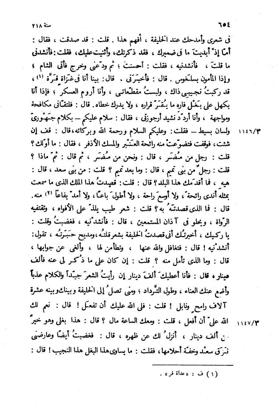 أنشدنيه! قَالَ: فتغافل والله عنها، وتطأمن لها، وألغى عن جوابها، قَالَ: وما الذي تأمل منه؟ قلت: إن كان على ما ذكر لي عنه فألف دينار، قَالَ: فأنا أعطيك ألف دينار إن رأيت الشعر جيدا والكلام عذبا وأضع عنك العناء، وطول الترداد، ومنى تصل إلى الخليفة وبينك وبينه عشرة آلاف رامح ونابل! قلت: فلي الله عليك أن تفعل! قَالَ: نعم لك الله علي أن أفعل، قلت: ومعك الساعة مال؟ قَالَ: هذا بغلي وهو خير من ألف دينار، أنزل لك عن ظهره، قَالَ: فغضبت أيضا وعارضني نرق سعد وخفة أحلامها، فقلت: ما يساوي هذا البغل هذا النجيب! قَالَ: