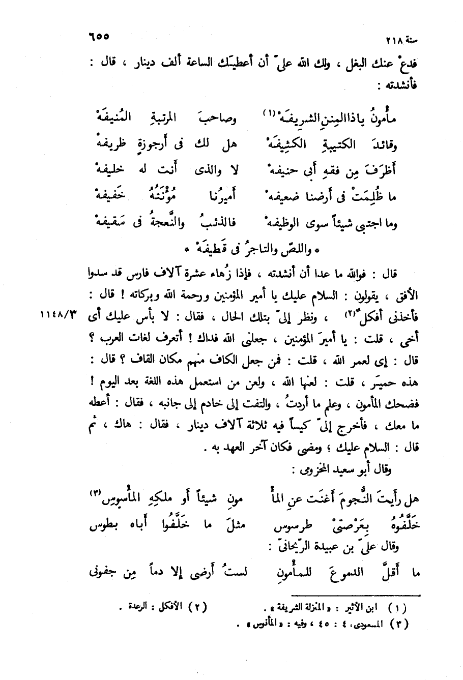 هذه حمير، قلت: لعنها الله، ولعن من استعمل هذه اللغة بعد اليوم! فضحك المأمون، وعلم ما أردت، والتفت إلى خادم إلى جانبه، فقال: أعطه ما معك، فأخرج إلي كيسا فيه ثلاثة آلاف دينار، فقال: هاك، ثم قَالَ: السلام عليك، ومضى فكان آخر العهد به.
