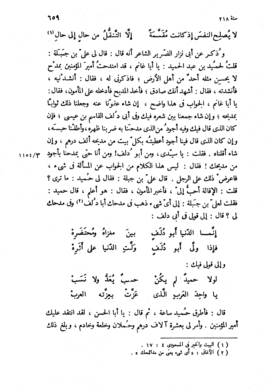 يا أبا غانم، الجواب في هذا واضح، إن شاء عفونا عنه وجعلنا ذلك ثوابا بمديحه، وإن شاء جمعنا بين شعره فيك وفي أبي دلف القاسم بْن عيسى، فإن كان الذي قَالَ فيك وفيه أجود من الذي مدحنا به ضربنا ظهره، وأطلنا حبسه، وإن كان الذي قَالَ فينا أجود أعطيته بكل بيت من مديحه ألف درهم، وإن شاء أقلناه فقلت: يا سيدي، ومن أبو دلف! ومن أنا حتى يمدحنا بأجود من مديحك! فقال: ليس هذا الكلام من الجواب عن المسألة في شيء، فاعرض ذلك على الرجل قَالَ علي بْن جبلة: فقال لي حميد: ما ترى؟