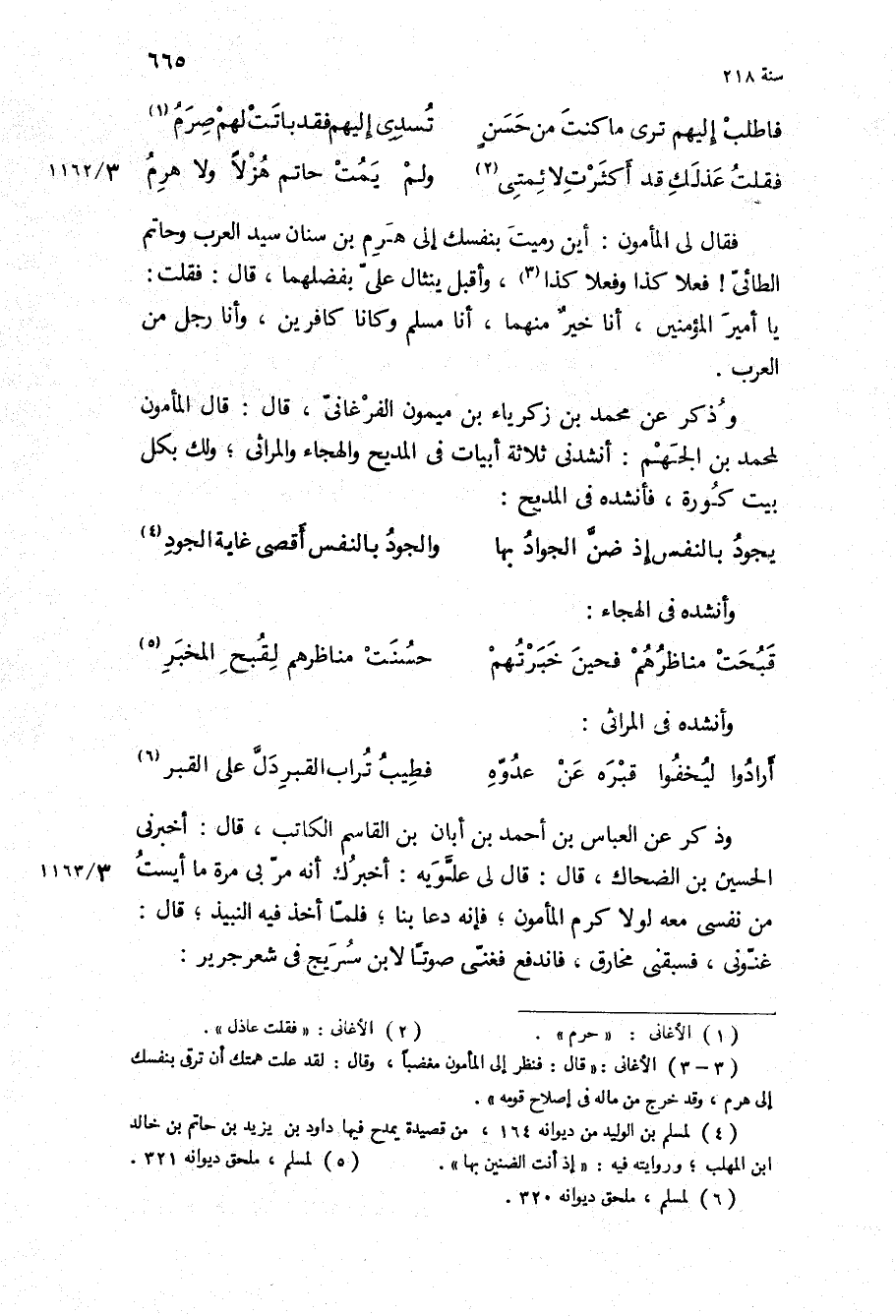 فقال لي المأمون: أين رميت بنفسك إلى هرم بْن سنان سيد العرب وحاتم الطائي! فعلا كذا وفعلا كذا، وأقبل ينثال علي بفضلهما، قَالَ: فقلت: