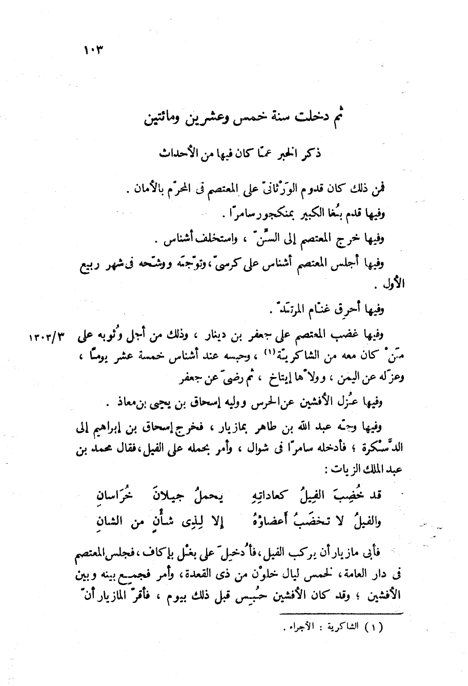 وفيها وجه عبد الله بن طاهر بمازيار، فخرج إسحاق بن إبراهيم إلى الدسكرة، فأدخله سامرا في شوال، وأمر بحمله على الفيل، فقال محمد بن عبد الملك الزيات: