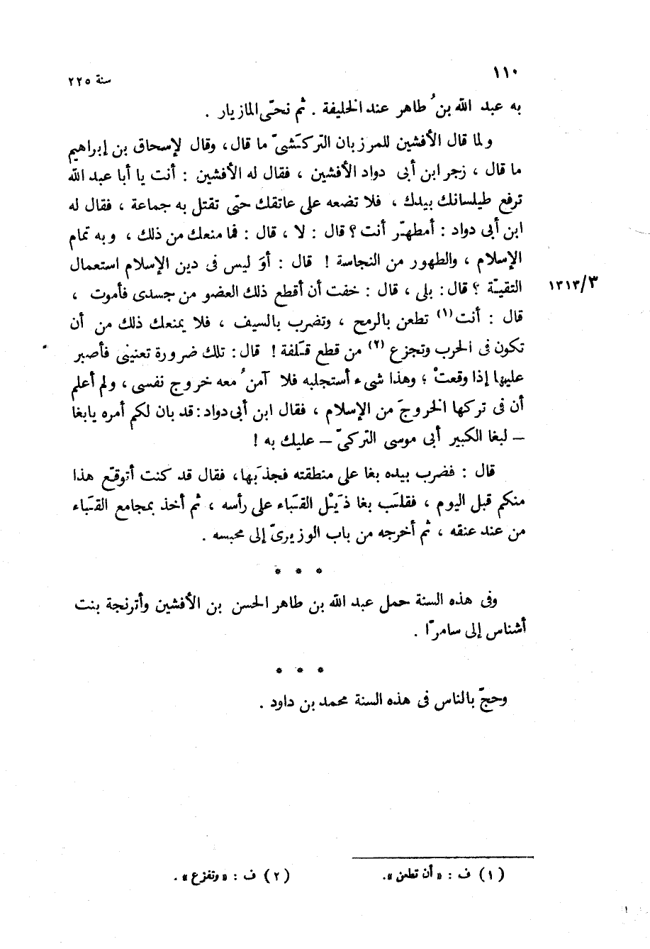 ولما قال الأفشين للمرزبان التركشى ما قال، وقال لإسحاق بن إبراهيم ما قال، زجر ابن ابى دواد الأفشين، فقال له الأفشين: أنت يا أبا عبد الله ترفع طيلسانك بيدك، فلا تضعه على عاتقك حتى تقتل به جماعة، فقال له ابن ابى دواد: أمطهر أنت؟ قال: لا، قال: فما منعك من ذلك، وبه تمام الإسلام، والطهور من النجاسة! قال: أوليس في دين الإسلام استعمال التقية؟ قال: بلى، قال: خفت أن أقطع ذلك العضو من جسدي فأموت، قال: أنت تطعن بالرمح، وتضرب بالسيف، فلا يمنعك ذلك من أن تكون في الحرب وتجزع من قطع قلفة! قال: تلك ضرورة تعنيني فأصبر عليها إذا وقعت، وهذا شيء أستجلبه فلا آمن معه خروج نفسي، ولم أعلم أن في تركها الخروج من الإسلام، فقال ابن ابى دواد: قد بان لكم أمره يا بغا- لبغا الكبير أبي موسى التركي- عليك به! قال: فضرب بيده بغا على منطقته فجذبها، فقال قد كنت أتوقع هذا منكم قبل اليوم، فقلب بغا ذيل القباء على رأسه، ثم أخذ بمجامع القباء من عند عنقه، ثم اخرجه من باب الوزيري الى محبسه.