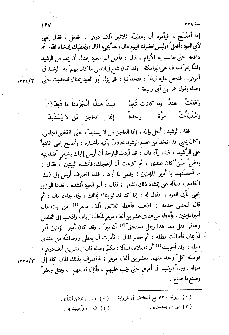 ما أحسنهما يا أمير المؤمنين! وفطن لما أراد، فلما انصرف أرسل إلى ذلك الخادم، فسأله عن إنشاد ذلك الشعر، فقال: أبو العود أنشده، فدعا الوزير يحيى بأبي العود، فقال له: إنا كنا قد لويناك بمالك، وقد جاءنا مال، ثم قال لبعض خدمه: اذهب فأعطه ثلاثين ألف درهم من بيت مال أمير المؤمنين، وأعطه من عندي عشرين ألف درهم لمطلنا إياه، واذهب إلى الفضل وجعفر فقل لهما هذا رجل مستحق أن يبر، وقد كان أمير المؤمنين أمر له بمال فأطلت مطله، ثم حضر المال، فأمرت أن يعطى ووصلته من عندي صلة، وقد أحببت أن تصلاه، فسألا: بكم وصله قال: بعشرين ألف درهم، فوصله كل واحد منهما بعشرين ألف درهم، فانصرف بذلك المال كله إلى منزله وجد الرشيد في أمرهم حتى وثب عليهم، وأزال نعمتهم، وقتل جعفرا وصنع ما صنع