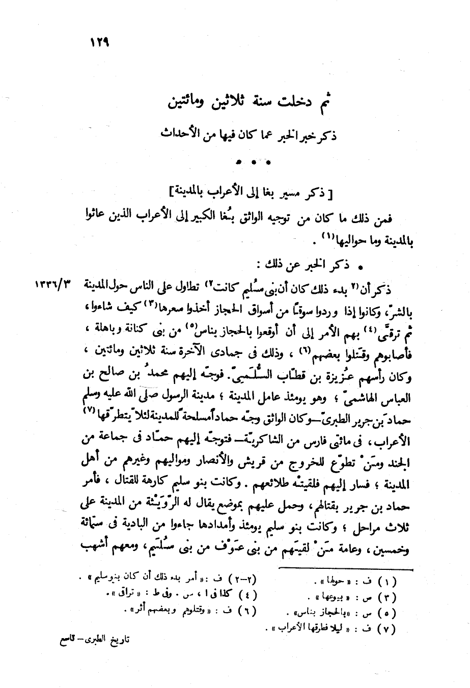 ذكر الخبر عن ذلك: ذكر ان بدء ذلك كان أن بني سليم كانت تطاول على الناس حول المدينة بالشر، وكانوا إذا وردوا سوقا من أسواق الحجاز أخذوا سعرها كيف شاءوا، ثم ترقى بهم الأمر إلى ان أوقعوا بالحجاز بناس من بني كنانة وباهلة، فأصابوهم وقتلوا بعضهم، وذلك في جمادى الآخرة سنة ثلاثين ومائتين، وكان رأسهم عزيزة بن قطاب السلمي فوجه إليهم محمد بن صالح بن العباس الهاشمي، وهو يومئذ عامل المدينة، مدينة الرسول ص حماد بن جرير الطبري- وكان الواثق وجه حمادا مسلحة للمدينة لئلا يتطرقها الأعراب، في مائتي فارس من الشاكرية- فتوجه إليهم حماد في جماعة من الجند ومن تطوع للخروج من قريش والأنصار ومواليهم وغيرهم من أهل المدينة، فسار إليهم فلقيته طلائعهم وكانت بنو سليم كارهة للقتال، فأمر حماد بن جرير بقتالهم، وحمل عليهم بموضع يقال له الرويثة من المدينة على ثلاث مراحل، وكانت بنو سليم يومئذ وامدادها جاءوا من البادية في ستمائه وخمسين، وعامة من لقيهم من بني عوف من بنى سليم، ومعهم اشهب