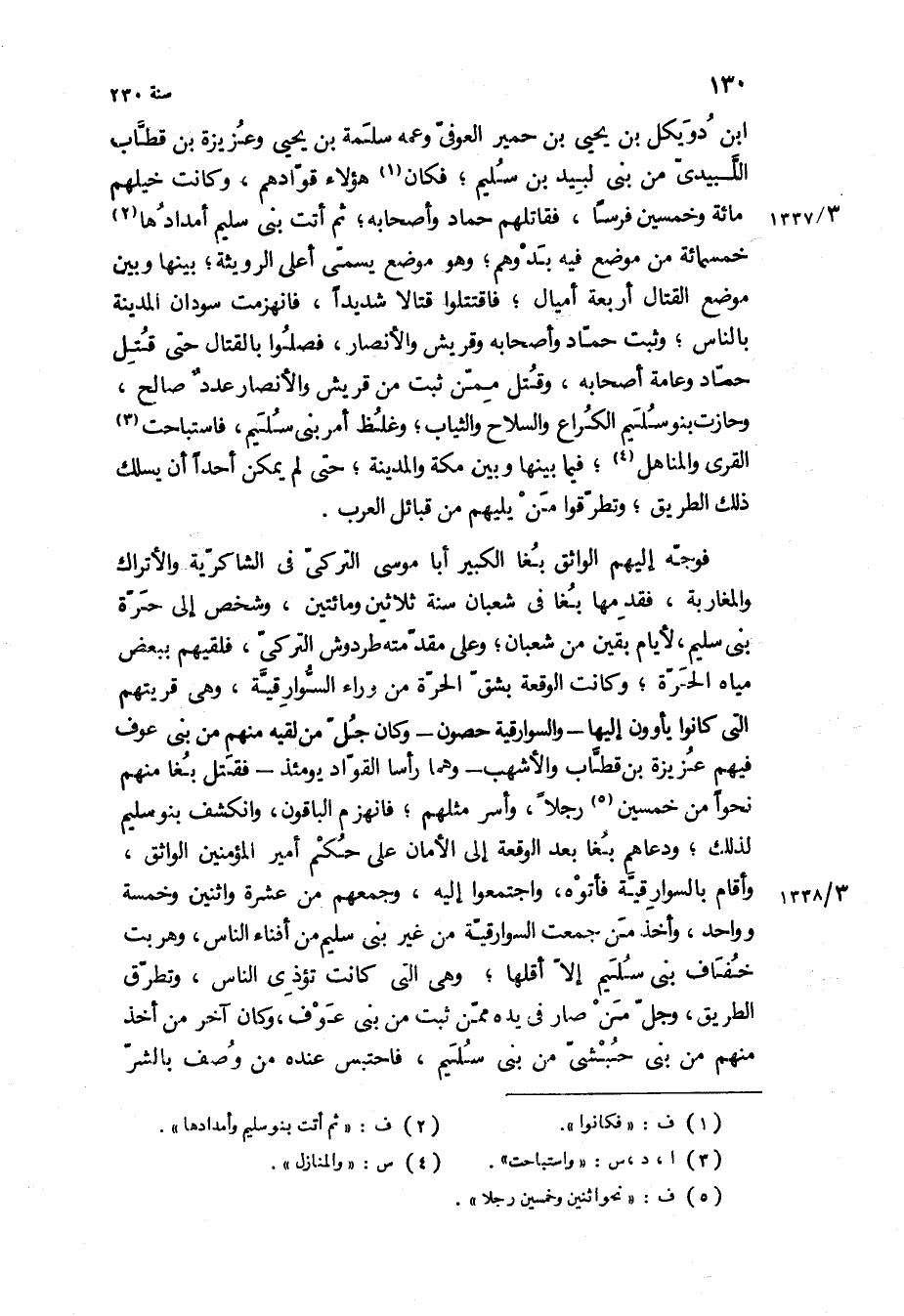 فوجه إليهم الواثق بغا الكبير أبا موسى التركي في الشاكرية والأتراك والمغاربة، فقدمها بغا في شعبان سنة ثلاثين ومائتين، وشخص إلى حرة بني سليم، لأيام بقين من شعبان، وعلى مقدمته طردوش التركي، فلقيهم ببعض مياه الحرة، وكانت الوقعة بشق الحرة من وراء السوارقية، وهي قريتهم التي كانوا يأوون إليها- والسوارقية حصون- وكان جل من لقيه منهم من بني عوف فيهم عزيزة بن قطاب والأشهب- وهما رأسا القواد يومئذ- فقتل بغا منهم نحوا من خمسين رجلا، وأسر مثلهم، فانهزم الباقون، وانكشف بنو سليم لذلك، ودعاهم بغا بعد الوقعة إلى الأمان على حكم أمير المؤمنين الواثق، واقام بالسوارقيه فاتوه، واجتمعوا إليه، وجمعهم من عشرة واثنين وخمسة وواحد، وأخذ من جمعت السوارقيه من غير بني سليم من أفناء الناس، وهربت خفاف بني سليم إلا أقلها، وهي التي كانت تؤذي الناس، وتطرق الطريق، وجل من صار في يده ممن ثبت من بني عوف، وكان آخر من أخذ منهم من بني حبشي من بني سليم، فاحتبس عنده من وصف بالشر