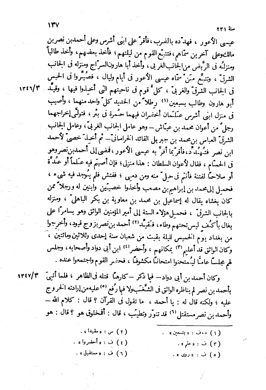 عيسى الأعور، فهدده بالضرب، فأقر على ابني أشرس وعلى أحمد بن نصر بن مالك وعلى آخرين سماهم، فتتبع القوم من ليلتهم، فأخذ بعضهم، وأخذ طالبا ومنزله في الربض من الجانب الغربي، وأخذ أبا هارون السراج ومنزله في الجانب الشرقي، وتتبع من سماه عيسى الأعور في أيام وليال، فصيروا في الحبس في الجانب الشرقي والغربي، كل قوم في ناحيتهم التي أخذوا فيها، وقيد أبو هارون وطالب بسبعين رطلا من الحديد كل واحد منهما، وأصيب في منزل ابني أشرس علمان أخضران فيهما حمرة في بئر، فتولى إخراجهما رجل من أعوان محمد بن عياش- وهو عامل الجانب الغربي، وعامل الجانب الشرقي العباس بن محمد بن جبريل القائد الخراساني- ثم أخذ خصي لأحمد ابن نصر فتهدد، فأقر بما أقر به عيسى الأعور، فمضى إلى أحمد بن نصر وهو في الحمام، فقال لأعوان السلطان: هذا منزلي، فإن أصبتم فيه علما أو عدة أو سلاحا لفتنة فأنتم في حل منه ومن دمي، ففتش فلم يوجد فيه شيء، فحمل إلى محمد بن إبراهيم بن مصعب وأخذوا خصيين وابنين له ورجلا ممن كان يغشاه يقال له إسماعيل بن محمد بن معاوية بن بكر الباهلي، ومنزله بالجانب الشرقي، فحمل هؤلاء الستة إلى أمير المؤمنين الواثق وهو بسامرا على بغال باكف ليس تحتهم وطاء، فقيد أحمد بن نصر بزوج قيود، وأخرجوا من بغداد يوم الخميس لليلة بقيت من شعبان سنة إحدى وثلاثين ومائتين، وكان الواثق قد أعلم بمكانهم، وأحضر ابن ابى دواد وأصحابه، وجلس لهم مجلسا عاما ليمتحنوا امتحانا مكشوفا، فحضر القوم واجتمعوا عنده.
