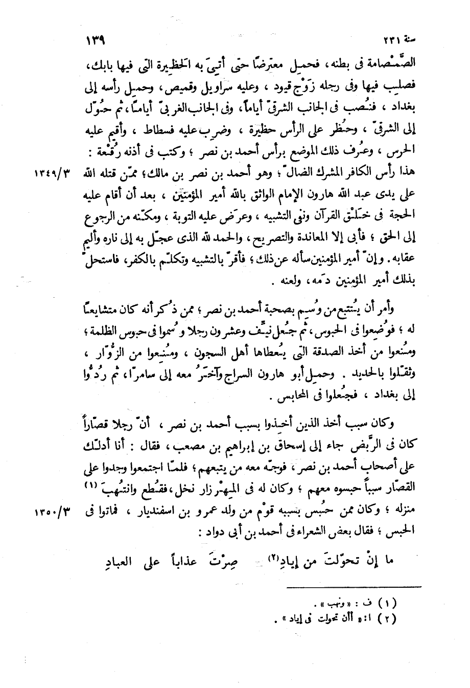 هذا رأس الكافر المشرك الضال، وهو أحمد بن نصر بن مالك، ممن قتله الله على يدي عبد الله هارون الإمام الواثق بالله أمير المؤمنين، بعد أن أقام عليه الحجة في خلق القرآن ونفي التشبيه، وعرض عليه التوبة، ومكنه من الرجوع إلى الحق، فأبى إلا المعاندة والتصريح، والحمد لله الذي عجل به إلى ناره وأليم عقابه وإن أمير المؤمنين سأله عن ذلك، فأقر بالتشبيه وتكلم بالكفر، فاستحل بذلك أمير المؤمنين دمه، ولعنه وأمر أن يتتبع من وسم بصحبة أحمد بن نصر، ممن ذكر انه كان متشايعا له، فوضعوا في الحبوس، ثم جعل نيف وعشرون رجلا وسموا في حبوس الظلمة، ومنعوا من أخذ الصدقة التي يعطاها أهل السجون، ومنعوا من الزوار، وثقلوا بالحديد وحمل أبو هارون السراج وآخر معه إلى سامرا، ثم ردوا إلى بغداد، فجعلوا في المحابس.