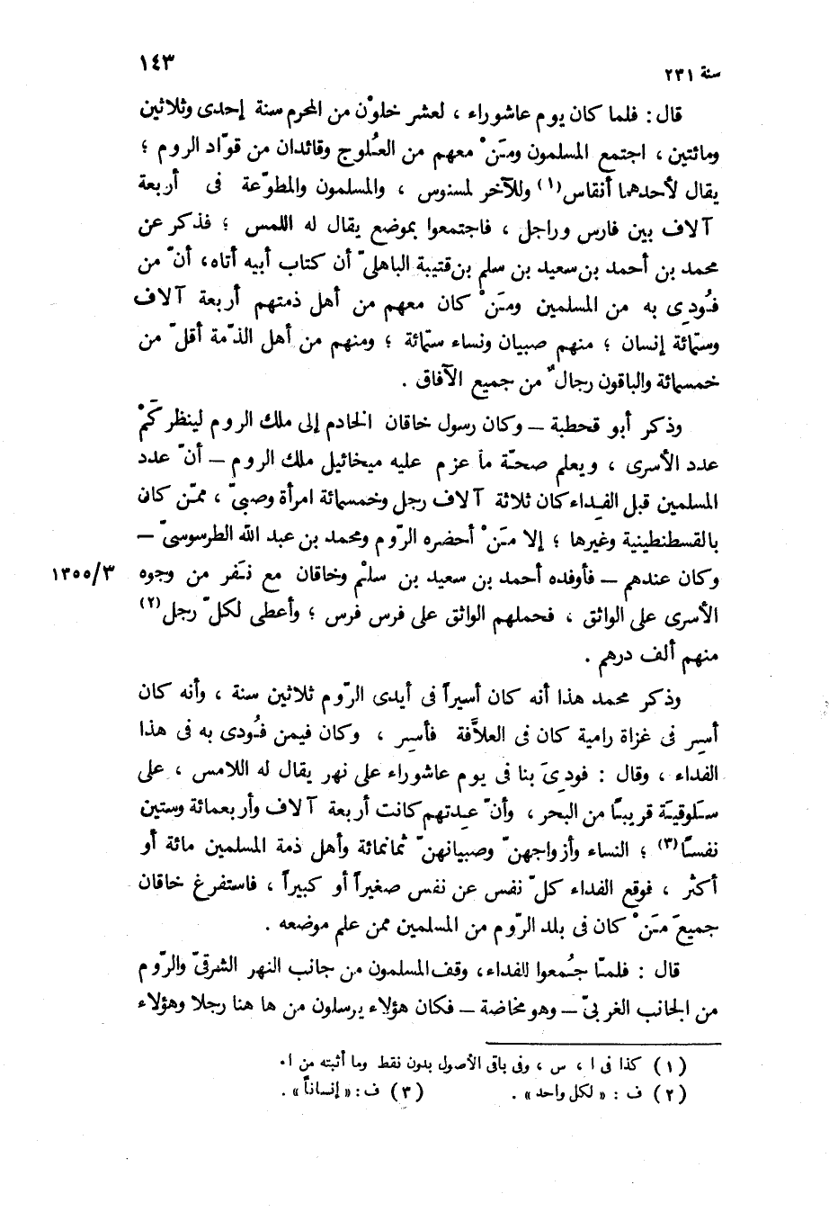 وذكر أبو قحطبة- وكان رسول خاقان الخادم إلى ملك الروم لينظركم عدد الأسرى، ويعلم صحة ما عزم عليه ميخائيل ملك الروم- أن عدد المسلمين قبل الفداء كان ثلاثة آلاف رجل وخمسمائة امرأة وصبي، ممن كان بالقسطنطينية وغيرها، إلا من أحضره الروم ومحمد بن عبد الله الطرسوسي- وكان عندهم- فأوفده أحمد بن سعيد بن سلم وخاقان مع نفر من وجوه الأسرى على الواثق، فحملهم الواثق على فرس فرس، وأعطى لكل رجل منهم ألف درهم.