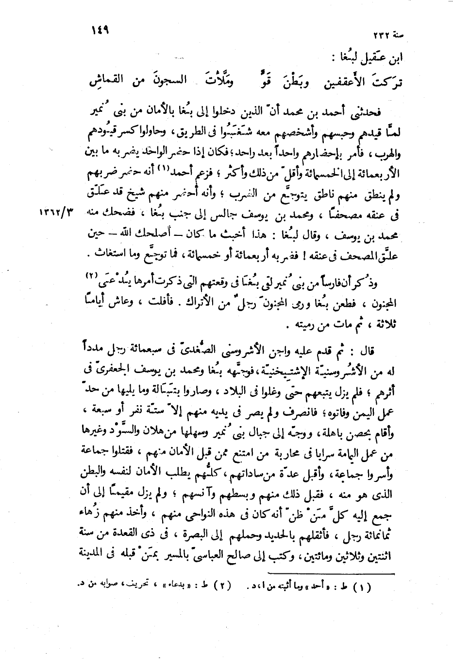 قال: ثم قدم عليه واجن الاشروسنى الصغدي في سبعمائة رجل مددا له من الأشروسنية الإشتيخنية، فوجهه بغا ومحمد بن يوسف الجعفري في أثرهم، فلم يزل يتبعهم حتى وغلوا في البلاد، وصاروا بتبالة وما يليها من حد عمل اليمن وفاتوه، فانصرف ولم يصر في يديه منهم إلا ستة نفر أو سبعة، وأقام بحصن باهلة، ووجه إلى جبال بني نمير وسهلها من هلان والسود وغيرها من عمل اليمامة سرايا في محاربه من امتنع ممن قبل الامان منهم، فقتلوا جماعة وأسروا جماعة، وأقبل عدة من ساداتهم، كلهم يطلب الامان لنفسه والبطن الذي هو منه، فقبل ذلك منهم وبسطهم وآنسهم، ولم يزل مقيما إلى أن جمع إليه كل من ظن أنه كان في هذه النواحي منهم، وأخذ منهم زهاء ثمانمائه رجل، فأثقلهم بالحديد وحملهم إلى البصرة، في ذي القعدة من سنة اثنتين وثلاثين ومائتين، وكتب إلى صالح العباسي بالمسير بمن قبله في المدينة