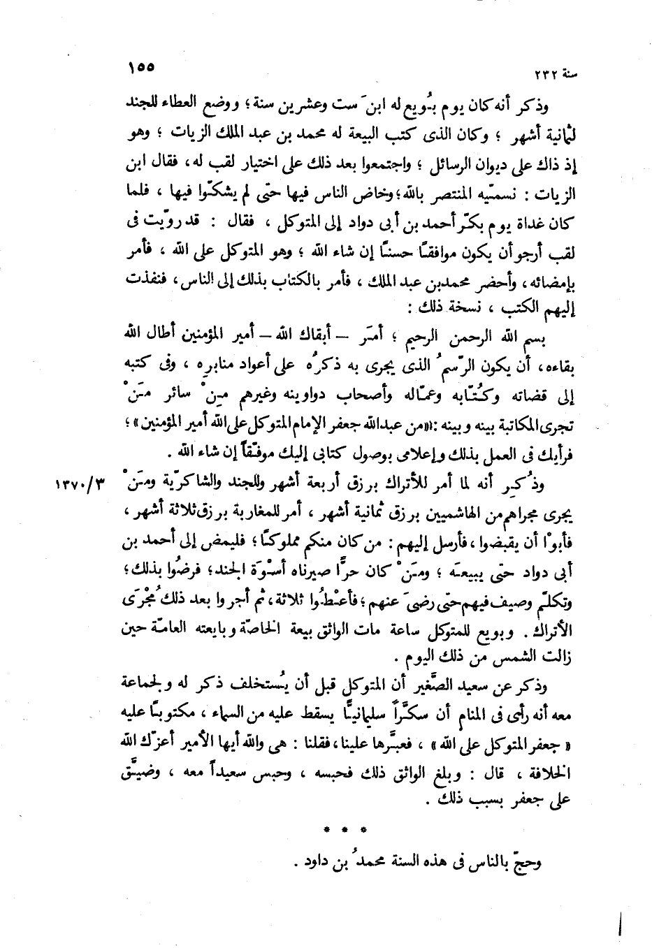 بسم الله الرحمن الرحيم، امر- ابقاك الله- أمير المؤمنين أطال الله بقاءه، أن يكون الرسم الذي يجري به ذكره على أعواد منابره، وفي كتبه إلى قضاته وكتابه وعماله وأصحاب دواوينه وغيرهم من سائر من تجرى المكاتبة بينه وبينه: من عبد الله جعفر الإمام المتوكل على الله أمير المؤمنين، فرأيك في العمل بذلك وإعلامي بوصول كتابي إليك موفقا إن شاء الله.