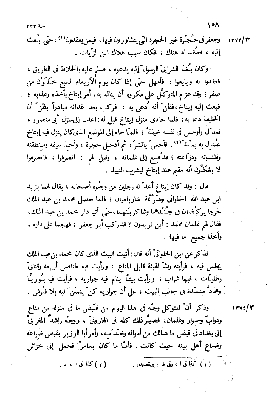 وجعفر في حجرة غير الحجرة التي يتشاورون فيها، فيمن يعقدون، حتى بعث إليه، فعقد له هناك، فكان سبب هلاك ابن الزيات وكان بغا الشرابي الرسول إليه يدعوه، فسلم عليه بالخلافة في الطريق، فعقدوا له وبايعوا، فأمهل حتى إذا كان يوم الأربعاء لسبع خلون من صفر، وقد عزم المتوكل على مكروه أن يناله به، أمر إيتاخ بأخذه وعذابه، فبعث إليه إيتاخ، فظن أنه دعي به، فركب بعد غدائه مبادرا يظن أن الخليفة دعا به، فلما حاذى منزل إيتاخ قيل له: اعدل إلى منزل أبي منصور، فعدل وأوجس في نفسه خيفة، فلما جاء إلى الموضع الذي كان ينزل فيه إيتاخ عدل به يمنه، فأحس بالشر، ثم أدخل حجرة، وأخذ سيفه ومنطقته وقلنسوته ودراعته، فدفع إلى غلمانه، وقيل لهم: انصرفوا، فانصرفوا لا يشكون أنه مقيم عند إيتاخ ليشرب النبيذ.