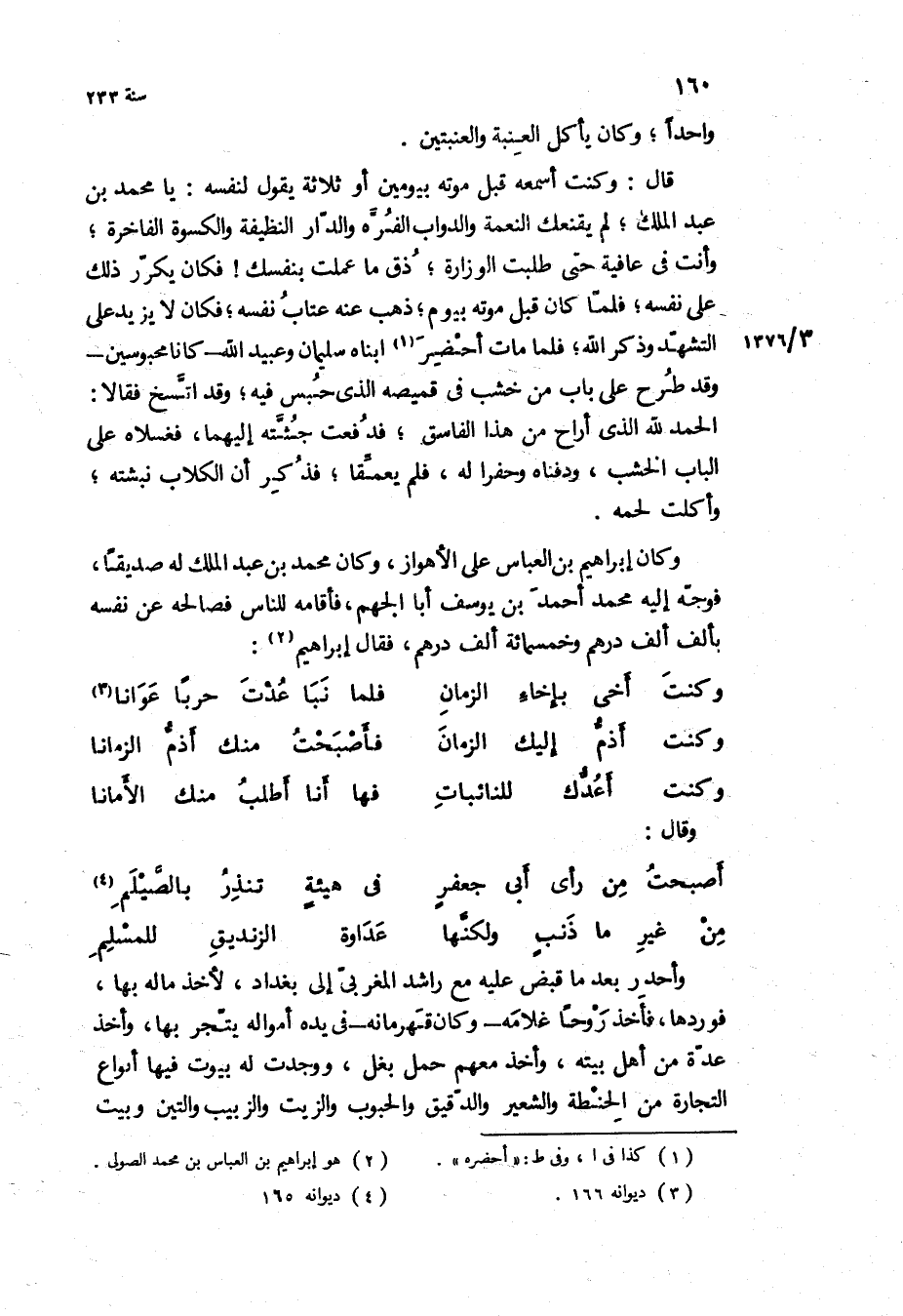واحدا، وكان يأكل العنبة والعنبتين قال: وكنت أسمعه قبل موته بيومين أو ثلاثة يقول لنفسه: يا محمد بن عبد الملك، لم يقنعك النعمة والدواب الفرة والدار النظيفة والكسوة الفاخرة، وأنت في عافية حتى طلبت الوزارة، ذق ما عملت بنفسك! فكان يكرر ذلك على نفسه، فلما كان قبل موته بيوم، ذهب عنه عتاب نفسه، فكان لا يزيد على التشهد وذكر الله، فلما مات احضر ابناه سليمان وعبيد الله- كانا محبوسين- وقد طرح على باب من خشب في قميصه الذي حبس فيه، وقد اتسخ فقالا: