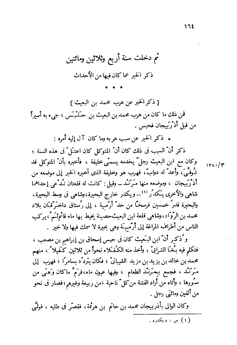 فمن ذلك ما كان من هرب محمد بن البعيث بن حلبس، جيء به أسيرا من قبل أذربيجان فحبس.