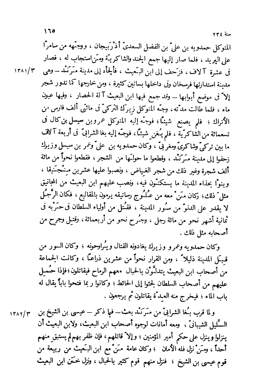المتوكل حمدويه بن علي بن الفضل السعدي أذربيجان، ووجهه من سامرا على البريد، فلما صار إليهما جمع الجند والشاكرية ومن استجاب له، فصار في عشرة آلاف، فزحف إلى ابن البعيث، فألجأه إلى مدينة مرند- وهي مدينة استدارتها فرسخان وفي داخلها بساتين كثيرة، ومن خارجها كما تدور شجر إلا في موضع أبوابها- وقد جمع فيها ابن البعيث آلة الحصار، وفيها عيون ماء، فلما طالت مدته، وجه المتوكل زيرك التركي في مائتي ألف فارس من الأتراك، فلم يصنع شيئا، فوجه إليه المتوكل عمرو بن سيسل بن كال في تسعمائة من الشاكرية، فلم يغن شيئا، فوجه إليه بغا الشرابي في أربعة آلاف ما بين تركي وشاكري ومغربي، وكان حمدويه بن علي وعمر بن سيسل وزيرك زحفوا إلى مدينة مرند، وقطعوا ما حولها من الشجر، فقطعوا نحوا من مائة ألف شجرة وغير ذلك من شجر الغياض، ونصبوا عليها عشرين منجنيقا، وبنوا بحذاء المدينة ما يستكنون فيه، ونصب عليهم ابن البعيث من المجانيق مثل ذلك، وكان من معه من علوج رساتيقه يرمون بالمقاليع، فكان الرجل لا يقدر على الدنو من سور المدينة، فقتل من أولياء السلطان في حربه في ثمانية أشهر نحو من مائه رجل، وجرح نحو من أربعمائة، وقتل وجرح من أصحابه مثل ذلك.