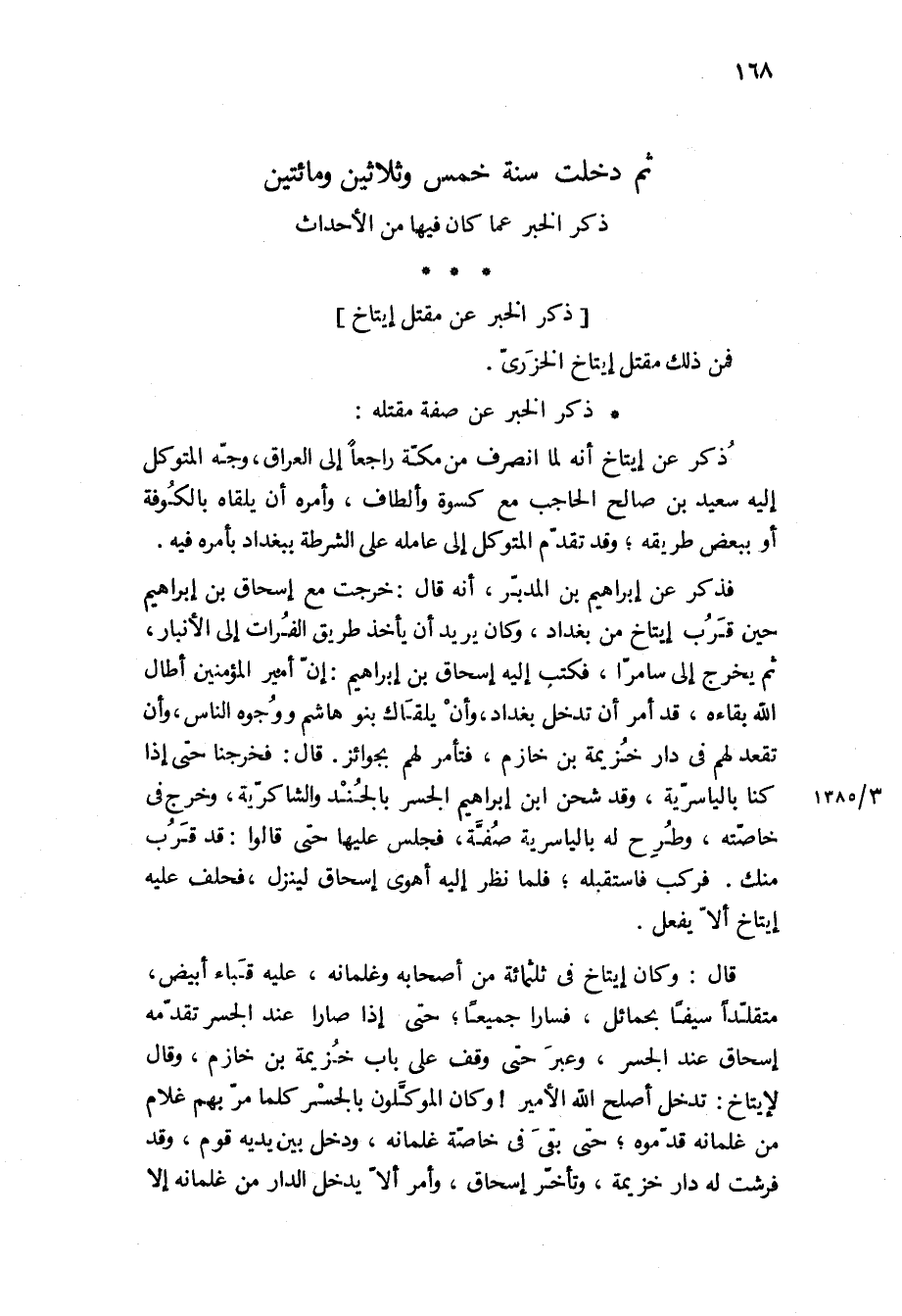 قال: وكان إيتاخ في ثلاثمائة من أصحابه وغلمانه، عليه قباء أبيض، متقلدا سيفا بحمائل، فسارا جميعا، حتى إذا صارا عند الجسر تقدمه إسحاق عند الجسر، وعبر حتى وقف على باب خزيمة بن خازم، وقال لإيتاخ تدخل أصلح الله الأمير! وكان الموكلون بالجسر كلما مر بهم غلام من غلمانه قدموه، حتى بقي في خاصة غلمانه، ودخل بين يديه قوم، وقد فرشت له دار خزيمة، وتأخر إسحاق، وأمر ألا يدخل الدار من غلمانه الا