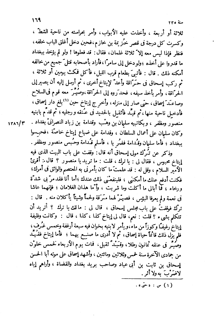 ترك فوقفت على باب مجلس إسحاق، قال لي: ما لك يا ترك؟ أتريد أن تتكلم بشيء؟ قلت: نعم، قال لي ايتاخ كذا، كذا، قال: وكانت وظيفة إيتاخ رغيفا وكوزا من ماء، ويأمر لابنيه بخوان فيه سبعة أرغفة وخمس غرف، فلم يزل ذلك قائما حياة إسحاق، ثم لا أدري ما صنع بهما، فأما إيتاخ فقيد وصير في عنقه ثمانون رطلا، وقيد ثقيل، فمات يوم الأربعاء لخمس خلون من جمادى الآخرة سنة خمس وثلاثين ومائتين، وأشهد إسحاق على موته أبا الحسن إسحاق بن ثابت بن أبي عباد وصاحب بريد بغداد والقضاة، وأراهم إياه لا ضرب به ولا أثر