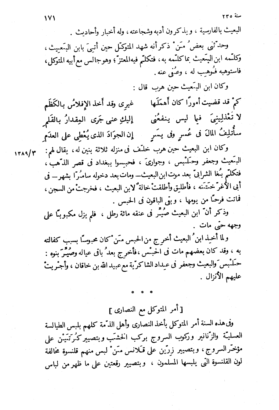 وفي هذه السنة أمر المتوكل بأخذ النصارى وأهل الذمة كلهم بلبس الطيالسة العسلية والزنانير وركوب السروج بركب الخشب وبتصيير كرتين على مؤخر السروج، وبتصيير زرين على قلانس من لبس منهم قلنسوة مخالفة لون القلنسوة التي يلبسها المسلمون، وبتصيير رقعتين على ما ظهر من لباس