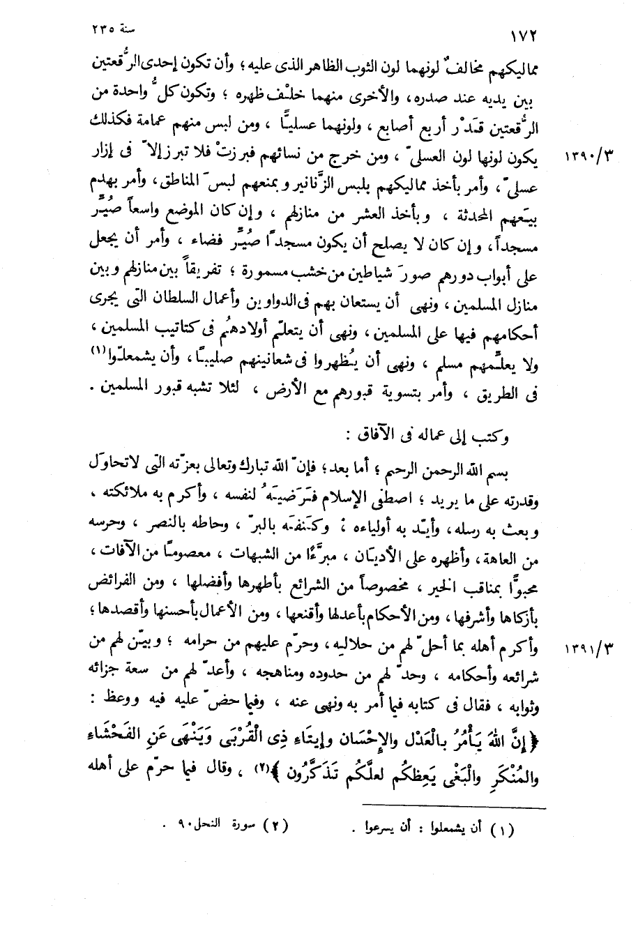 مماليكهم مخالف لونهما لون الثوب الظاهر الذي عليه، وأن تكون إحدى الرقعتين بين يديه عند صدره، والأخرى منهما خلف ظهره، وتكون كل واحدة من الرقعتين قدر أربع أصابع، ولونهما عسليا، ومن لبس منهم عمامة فكذلك يكون لونها لون العسلي، ومن خرج من نسائهم فبرزت فلا تبرز إلا في إزار عسلي، وأمر بأخذ مماليكهم بلبس الزنانير وبمنعهم لبس المناطق، وأمر بهدم بيعهم المحدثة، وبأخذ العشر من منازلهم، وان كان الموضع واسعا صير مسجدا، وإن كان لا يصلح أن يكون مسجدا صير فضاء، وأمر أن يجعل على أبواب دورهم صور شياطين من خشب مسمورة، تفريقا بين منازلهم وبين منازل المسلمين، ونهى أن يستعان بهم في الدواوين وأعمال السلطان التي يجري أحكامهم فيها على المسلمين، ونهى أن يتعلم أولادهم في كتاتيب المسلمين، ولا يعلمهم مسلم، ونهى أن يظهروا في شعانينهم صليبا، وأن يشمعلوا في الطريق، وأمر بتسوية قبورهم مع الأرض، لئلا تشبه قبور المسلمين.