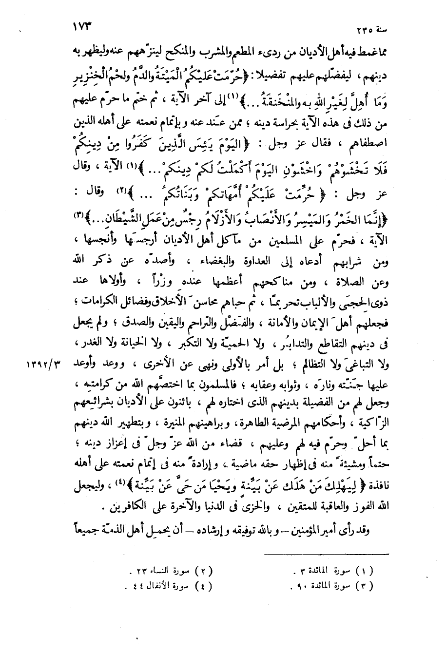 «إِنَّمَا الْخَمْرُ وَالْمَيْسِرُ وَالْأَنْصابُ وَالْأَزْلامُ رِجْسٌ مِنْ عَمَلِ الشَّيْطانِ» الآية، فحرم على المسلمين من مآكل أهل الأديان أرجسها وأنجسها، ومن شرابهم أدعاه إلى العداوة والبغضاء، وأصده عن ذكر الله وعن الصلاة، ومن مناكحهم أعظمها عنده وزرا، وأولاها عند ذوي الحجى والألباب تحريما، ثم حباهم محاسن الأخلاق وفضائل الكرامات، فجعلهم أهل الإيمان والأمانة، والفضل والتراحم واليقين والصدق، ولم يجعل في دينهم التقاطع والتدابر، ولا الحمية ولا التكبر، ولا الخيانة ولا الغدر، ولا التباغي ولا التظالم، بل أمر بالأولى ونهى عن الأخرى، ووعد وأوعد عليها جنته وناره، وثوابه وعقابه، فالمسلمون بما اختصهم الله من كرامته، وجعل لهم من الفضيلة بدينهم الذي اختاره لهم، بائنون على الأديان بشرائعهم الزاكية، وأحكامهم المرضية الطاهرة، وبراهينهم المنيرة، وبتطهير الله دينهم بما أحل وحرم فيه لهم وعليهم، قضاء من الله عز وجل في إعزاز دينه، حتما ومشيئة منه في إظهار حقه ماضية، واراده منه في اتمام نعمته على أهله نافذة «لِيَهْلِكَ مَنْ هَلَكَ عَنْ بَيِّنَةٍ وَيَحْيى مَنْ حَيَّ عَنْ بَيِّنَةٍ» ، وليجعل الله الفوز والعاقبة للمتقين، والخزي في الدنيا والآخرة على الكافرين.
