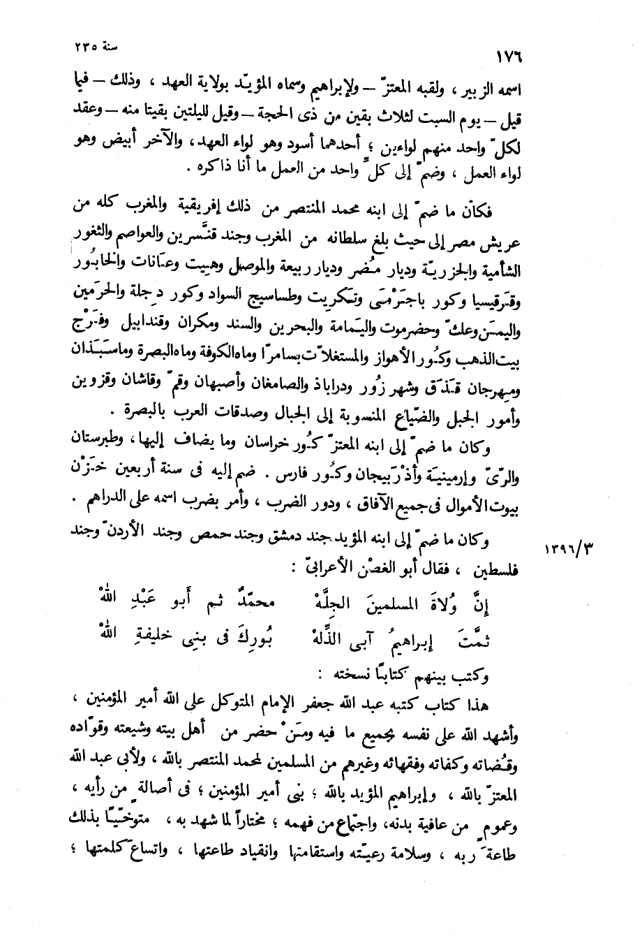 هذا كتاب كتبه عبد الله جعفر الإمام المتوكل على الله أمير المؤمنين، وأشهد الله على نفسه بجميع ما فيه ومن حضر من أهل بيته وشيعته وقواده وقضاته وكفاته وفقهائه وغيرهم من المسلمين لمحمد المنتصر بالله، ولأبي عبد الله المعتز بالله، وإبراهيم المؤيد بالله، بني أمير المؤمنين، في أصالة من رأيه، وعموم من عافية بدنه، واجتماع من فهمه، مختارا لما شهد به، متوخيا بذلك طاعة ربه، وسلامة رعيته واستقامتها وانقياد طاعتها، واتساع كلمتها،