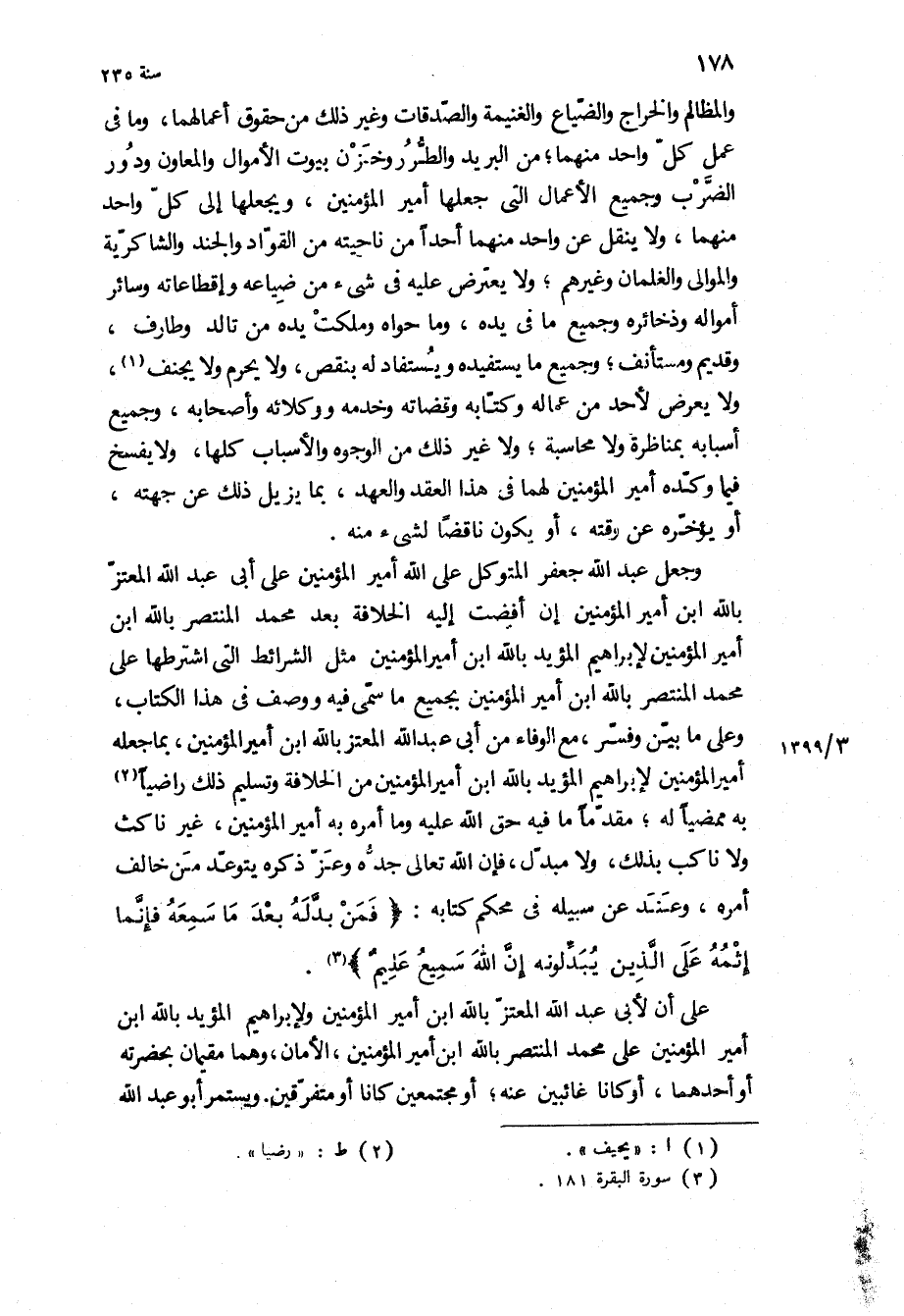 وجعل عبد الله جعفر المتوكل على الله أمير المؤمنين على أبي عبد الله المعتز بالله ابن أمير المؤمنين إن أفضت إليه الخلافة بعد محمد المنتصر بالله ابن أمير المؤمنين لإبراهيم المؤيد بالله ابن أمير المؤمنين مثل الشرائط التي اشترطها على محمد المنتصر بالله ابن أمير المؤمنين بجميع ما سمى فيه ووصف في هذا الكتاب، وعلى ما بين وفسر، مع الوفاء من أبي عبد الله المعتز بالله ابن أمير المؤمنين، بما جعله أمير المؤمنين لإبراهيم المؤيد بالله ابن أمير المؤمنين من الخلافة وتسليم ذلك راضيا به ممضيا له، مقدما ما فيه حق الله عليه وما أمره به أمير المؤمنين، غير ناكث ولا ناكب بذلك، ولا مبدل، فإن الله تعالى جده وعز ذكره يتوعد من خالف أمره، وعند عن سبيله في محكم كتابه: «فَمَنْ بَدَّلَهُ بَعْدَ مَا سَمِعَهُ فَإِنَّما إِثْمُهُ عَلَى الَّذِينَ يُبَدِّلُونَهُ إِنَّ اللَّهَ سَمِيعٌ عَلِيمٌ.