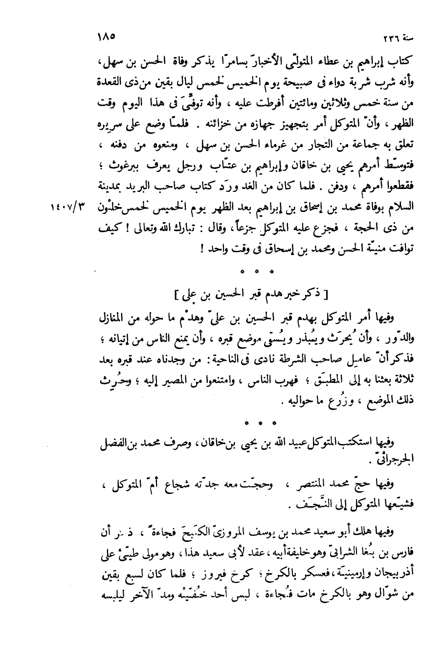 وفيها أمر المتوكل بهدم قبر الحسين بن علي وهدم ما حوله من المنازل والدور، وأن يحرث ويبذر ويسقى موضع قبره، وأن يمنع الناس من إتيانه، فذكر أن عامل صاحب الشرطة نادى في الناحية: من وجدناه عند قبره بعد ثلاثة بعثنا به إلى المطبق، فهرب الناس، وامتنعوا من المصير إليه، وحرث ذلك الموضع، وزرع ما حواليه.