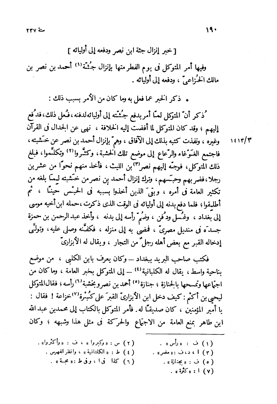 وفيها أمر المتوكل في يوم الفطر منها بإنزال جثة أحمد بن نصر بن مالك الخزاعي، ودفعه إلى أوليائه ذكر الخبر عما فعل به وما كان من الأمر بسبب ذلك: