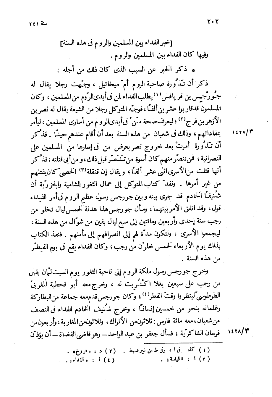 خبر الفداء بين المسلمين والروم في هذه السنه وفيها كان الفداء بين المسلمين والروم.