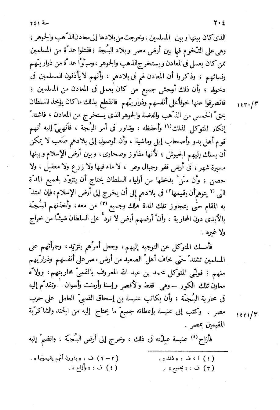 الذي كان بينها وبين المسلمين، وخرجت من بلادها إلى معادن الذهب والجوهر، وهي على التخوم فيما بين أرض مصر وبلاد البجة، فقتلوا عدة من المسلمين ممن كان يعمل في المعادن ويستخرج الذهب والجوهر، وسبوا عدة من ذراريهم ونسائهم، وذكروا أن المعادن لهم في بلادهم، وأنهم لا يأذنون للمسلمين في دخولها، وأن ذلك أوحش جميع من كان يعمل في المعادن من المسلمين، فانصرفوا عنها خوفا على أنفسهم وذراريهم فانقطع بذلك ما كان يؤخذ للسلطان بحق الخمس من الذهب والفضة والجوهر الذي يستخرج من المعادن، فاشتد إنكار المتوكل لذلك وأحفظه، وشاور في أمر البجة، فأنهي إليه أنهم قوم أهل بدو وأصحاب إبل وماشية، وأن الوصول إلى بلادهم صعب لا يمكن أن يسلك إليهم الجيوش، لأنها مفاوز وصحاري، وبين أرض الإسلام وبينها مسيره شهر، في ارض قفر وجبال وعر، لا ماء فيها ولا زرع ولا معقل، ولا حصن، وأن من يدخلها من أولياء السلطان يحتاج أن يتزود لجميع المدة التي يتوهم أن يقيمها في بلادهم إلى أن يخرج إلى أرض الإسلام، فإن امتد به المقام حتى يتجاوز تلك المدة هلك وجميع من معه، وأخذتهم البجة بالأيدي دون المحاربة، وأن أرضهم أرض لا ترد على السلطان شيئا من خراج ولا غيره.