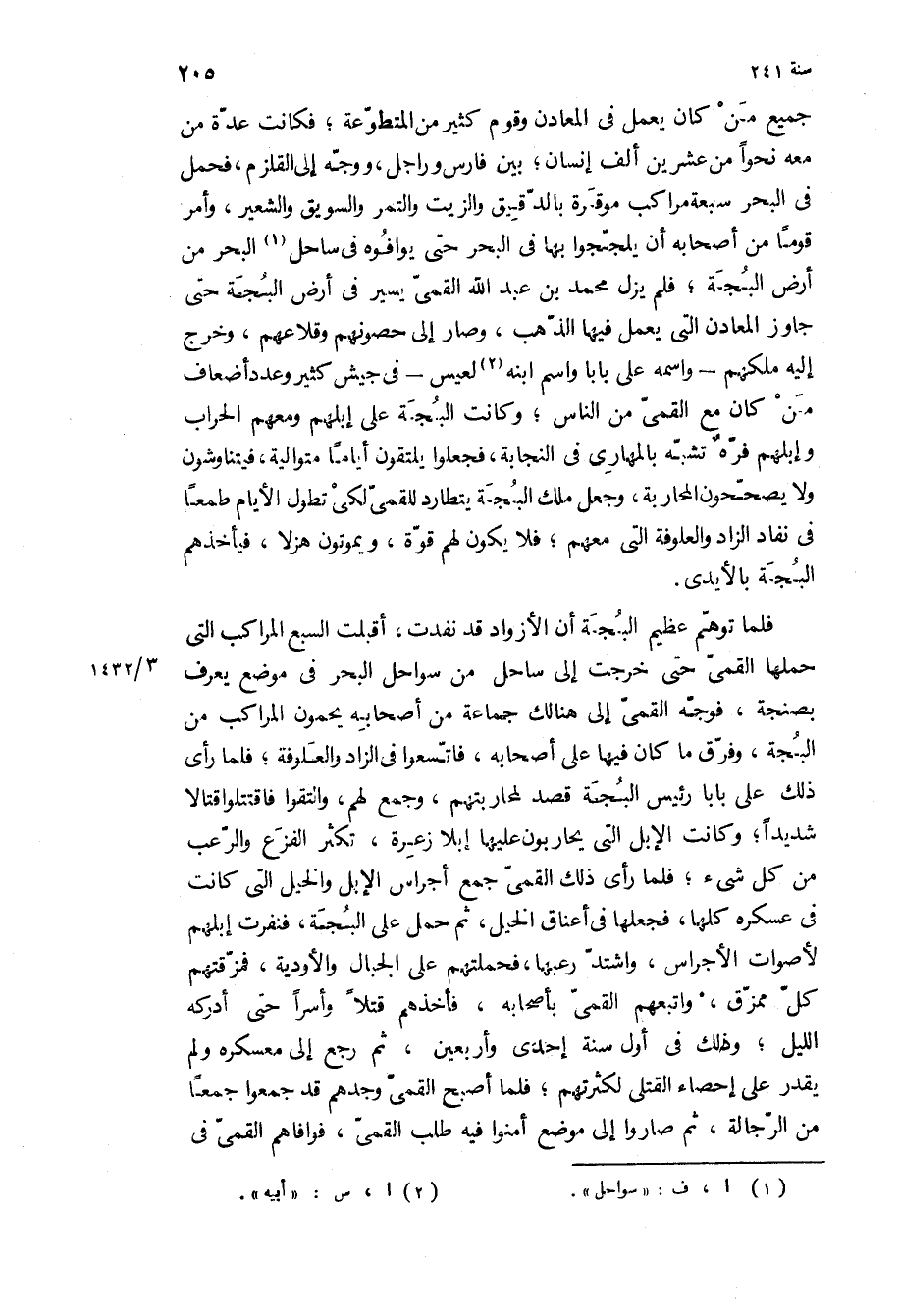 جميع من كان يعمل في المعادن وقوم كثير من المتطوعة، فكانت عدة من معه نحوا من عشرين ألف إنسان، بين فارس وراجل، ووجه إلى القلزم، فحمل في البحر سبعة مراكب موقرة بالدقيق والزيت والتمر والسويق والشعير، وأمر قوما من أصحابه أن يلججوا بها في البحر حتى يوافوه في ساحل البحر من أرض البجة، فلم يزل محمد بن عبد الله القمي يسير في أرض البجة حتى جاوز المعادن التي يعمل فيها الذهب، وصار إلى حصونهم وقلاعهم، وخرج إليه ملكهم- واسمه علي بابا واسم ابنه لعيس- في جيش كثير وعدد أضعاف من كان مع القمي من الناس، وكانت البجة على إبلهم ومعهم الحراب وإبلهم فرة تشبه بالمهاري في النجابة، فجعلوا يلتقون أياما متوالية، فيتناوشون ولا يصححون المحاربة، وجعل ملك البجة يتطارد للقمي لكي تطول الأيام طمعا في نفاد الزاد والعلوفة التي معهم، فلا يكون لهم قوة، ويموتون هزلا، فيأخذهم البجة بالأيدي.