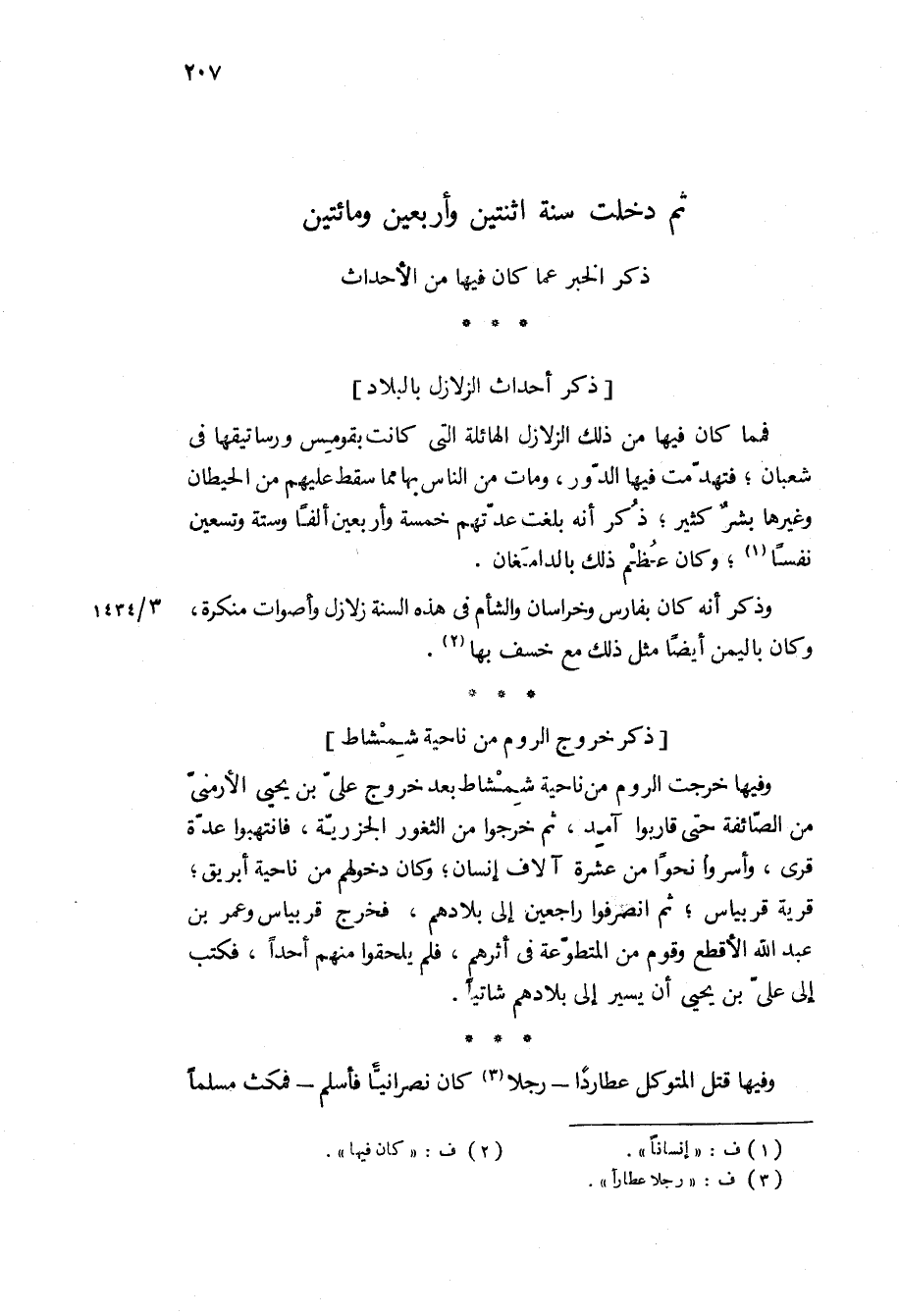 وفيها قتل المتوكل عطاردا- رجلا كان نصرانيا فأسلم- فمكث مسلما
