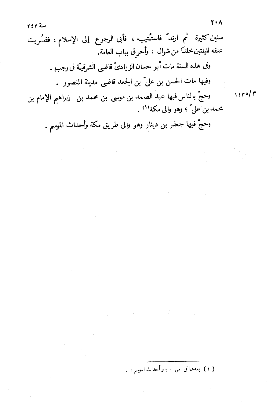 سنين كثيرة ثم ارتد فاستتيب، فأبى الرجوع إلى الإسلام، فضربت عنقه لليلتين خلتا من شوال، وأحرق بباب العامة.