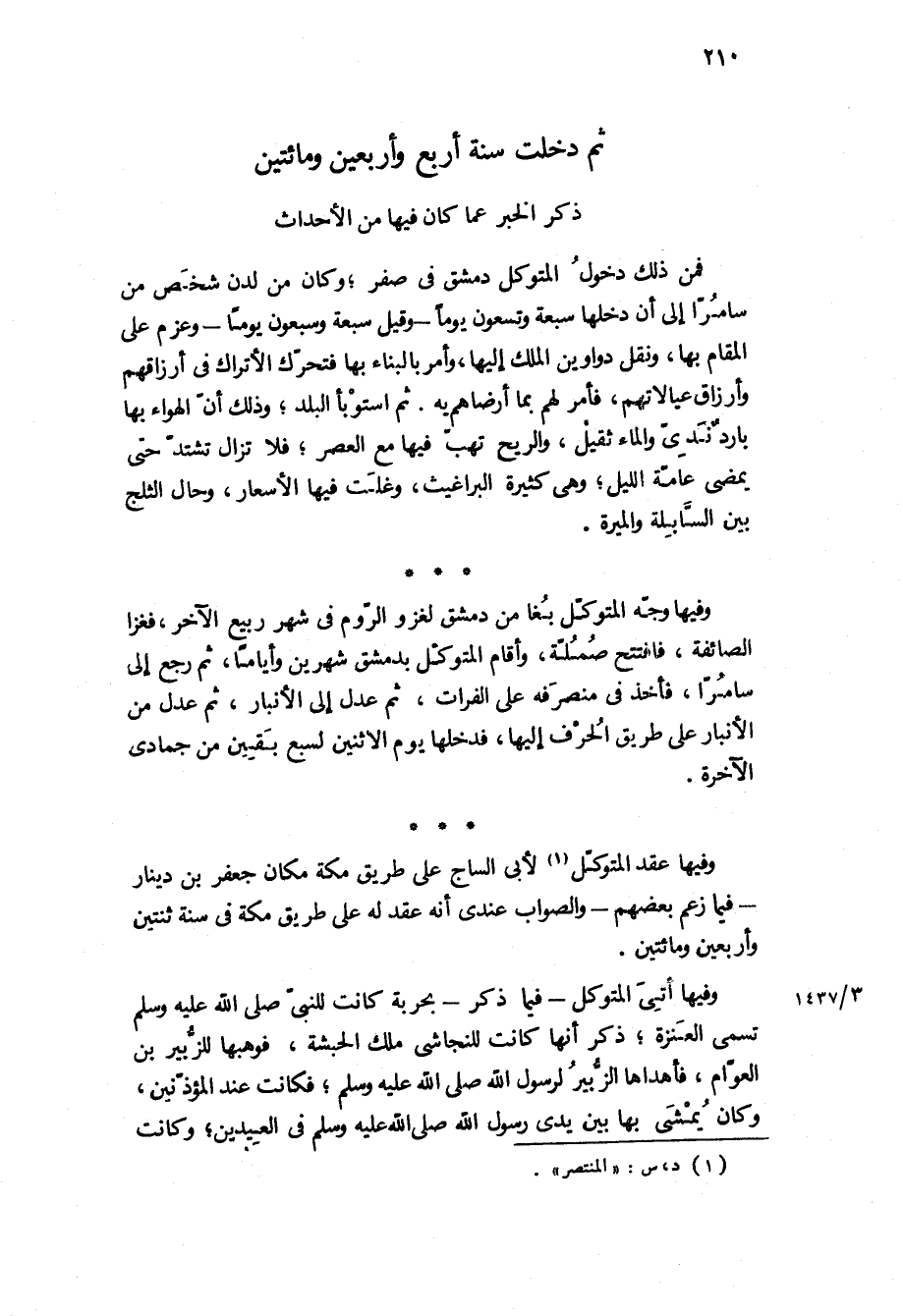 (ذكر الخبر عما كَانَ فِيهَا من الأحداث) فمن ذلك دخول المتوكل دمشق في صفر، وكان من لدن شخص من سامرا إلى أن دخلها سبعة وتسعون يوما- وقيل سبعة وسبعون يوما- وعزم على المقام بها، ونقل دواوين الملك إليها، وأمر بالبناء بها فتحرك الأتراك في أرزاقهم وأرزاق عيالاتهم، فأمر لهم بما أرضاهم به ثم استوبأ البلد، وذلك أن الهواء بها بارد ندي والماء ثقيل، والريح تهب فيها مع العصر، فلا تزال تشتد حتى يمضي عامة الليل، وهي كثيرة البراغيث، وغلت فيها الأسعار، وحال الثلج بين السابلة والميرة.