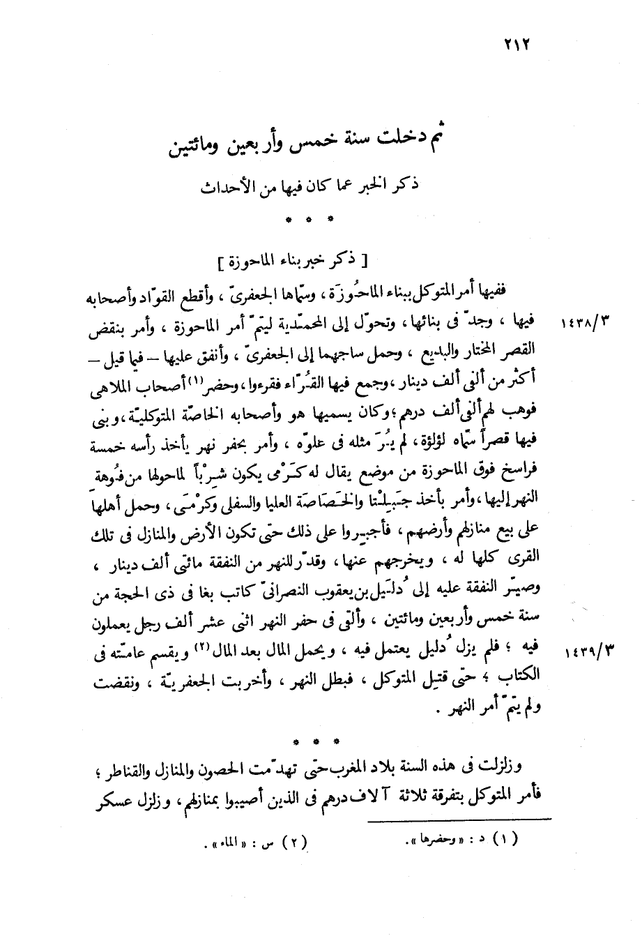 ففيها أمر المتوكل ببناء الماحوزة، وسماها الجعفري، وأقطع القواد وأصحابه فيها، وجد في بنائها، وتحول إلى المحمدية ليتم أمر الماحوزة، وأمر بنقض القصر المختار والبديع، وحمل ساجهما إلى الجعفري، وأنفق عليها- فيما قيل- أكثر من ألفي ألف دينار، وجمع فيها القراء فقرءوا، وحضر أصحاب الملاهي فوهب لهم ألفي ألف درهم، وكان يسميها هو وأصحابه الخاصة المتوكلية، وبنى فيها قصرا سماه لؤلؤة، لم ير مثله في علوه، وأمر بحفر نهر يأخذ رأسه خمسة فراسخ فوق الماحوزة من موضع يقال له كرمى يكون شربا لما حولها من فوهه النهر إليها، وأمر بأخذ جبلتا والخصاصة العليا والسفلى وكرمى، وحمل أهلها على بيع منازلهم وأرضهم، فأجبروا على ذلك حتى تكون الأرض والمنازل في تلك القرى كلها له، ويخرجهم عنها، وقدر للنهر من النفقة مائتي ألف دينار، وصير النفقة عليه إلى دليل بن يعقوب النصراني كاتب بغا في ذي الحجة من سنة خمس وأربعين ومائتين، وألقى في حفر النهر اثني عشر ألف رجل يعملون فيه، فلم يزل دليل يعتمل فيه، ويحمل المال بعد المال ويقسم عامته في الكتاب، حتى قتل المتوكل، فبطل النهر، وأخربت الجعفرية، ونقضت ولم يتم أمر النهر.