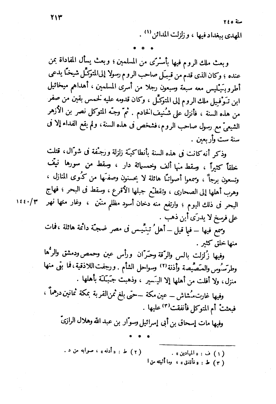 المهدي ببغداد فيها، وزلزلت المدائن وبعث ملك الروم فيها بأسرى من المسلمين، وبعث يسأل المفاداة بمن عنده، وكان الذي قدم من قبل صاحب الروم رسولا إلى المتوكل شيخا يدعى اطروبيليس معه سبعة وسبعون رجلا من أسرى المسلمين، اهداهم ميخائيل ابن توفيل ملك الروم إلى المتوكل، وكان قدومه عليه لخمس بقين من صفر من هذه السنة، فأنزل على شنيف الخادم ثم وجه المتوكل نصر بن الأزهر الشيعي مع رسول صاحب الروم، فشخص في هذه السنة، ولم يقع الفداء إلا في سنة ست وأربعين.