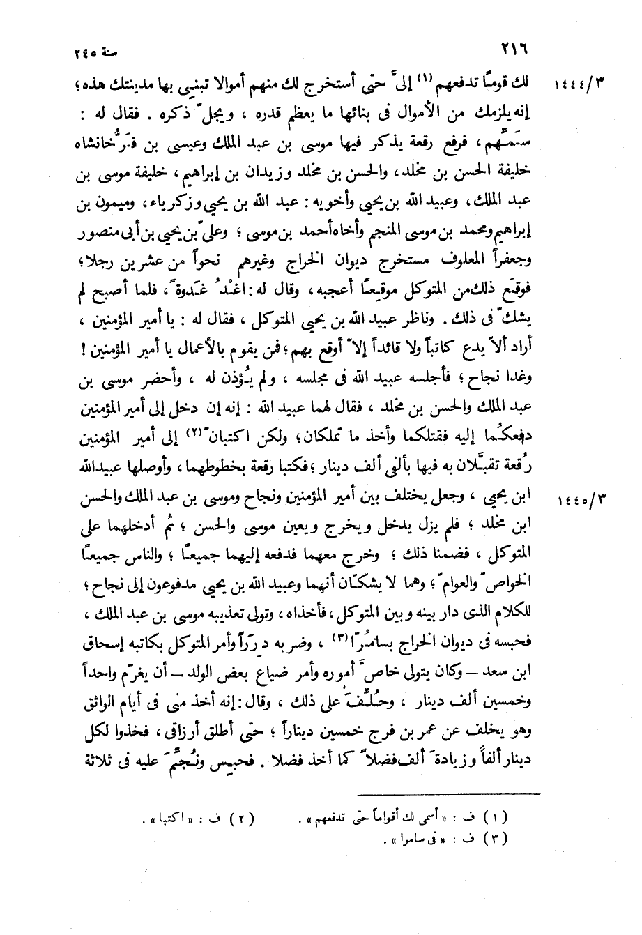 لك قوما تدفعهم إلي حتى أستخرج لك منهم أموالا تبني بها مدينتك هذه، أنه يلزمك من الأموال في بنائها ما يعظم قدره، ويجل ذكره فقال له: سمهم، فرفع رقعة يذكر فيها موسى بن عبد الملك وعيسى بن فرخان شاه خليفة الحسن بن مخلد، والحسن بن مخلد وزيدان بن إبراهيم، خليفة موسى بن عبد الملك، وعبيد الله بن يحيى وأخويه: عبد الله بن يحيى وزكرياء وميمون بن إبراهيم ومحمد بن موسى المنجم وأخاه أحمد بن موسى، وعلي بن يحيى بن أبي منصور وجعفرا المعلوف مستخرج ديوان الخراج وغيرهم نحوا من عشرين رجلا، فوقع ذلك من المتوكل موقعا أعجبه، وقال له: اغد غدوة، فلما أصبح لم يشك في ذلك وناظر عبيد الله بن يحيى المتوكل، فقال له: يا أمير المؤمنين، أراد ألا يدع كاتبا ولا قائدا إلا أوقع بهم، فمن يقوم بالأعمال يا أمير المؤمنين! وغدا نجاح، فأجلسه عبيد الله في مجلسه، ولم يؤذن له، وأحضر موسى بن عبد الملك والحسن بن مخلد، فقال لهما عبيد الله: أنه إن دخل إلي أمير المؤمنين دفعكما إليه فقتلكما وأخذ ما تملكان، ولكن اكتبان إلى أمير المؤمنين رقعة تقبلان به فيها بألفي ألف دينار، فكتبا رقعه بخطوطهما، وأوصلها عبيد الله ابن يحيى، وجعل يختلف بين أمير المؤمنين ونجاح وموسى بن عبد الملك والحسن ابن مخلد، فلم يزل يدخل ويخرج ويعين موسى والحسن، ثم أدخلهما على المتوكل، فضمنا ذلك، وخرج معهما فدفعه إليهما جميعا، والناس جميعا الخواص والعوام، وهما لا يشكان أنهما وعبيد الله بن يحيى مدفوعون إلى نجاح، للكلام الذي دار بينه وبين المتوكل، فأخذاه، وتولى تعذيبه موسى بن عبد الملك، فحبسه في ديوان الخراج بسامرا، وضربه دررا وأمر المتوكل بكاتبه إسحاق ابن سعد- وكان يتولى خاص أموره وأمر ضياع بعض الولد- أن يغرم واحدا وخمسين ألف دينار، وحلف على ذلك، وقال: أنه أخذ مني في أيام الواثق وهو يخلف عن عمر بن فرج خمسين دينارا، حتى أطلق أرزاقي، فخذوا لكل دينار ألفا وزيادة ألف فضلا كما أخذ فضلا فحبس ونجم عليه في ثلاثة