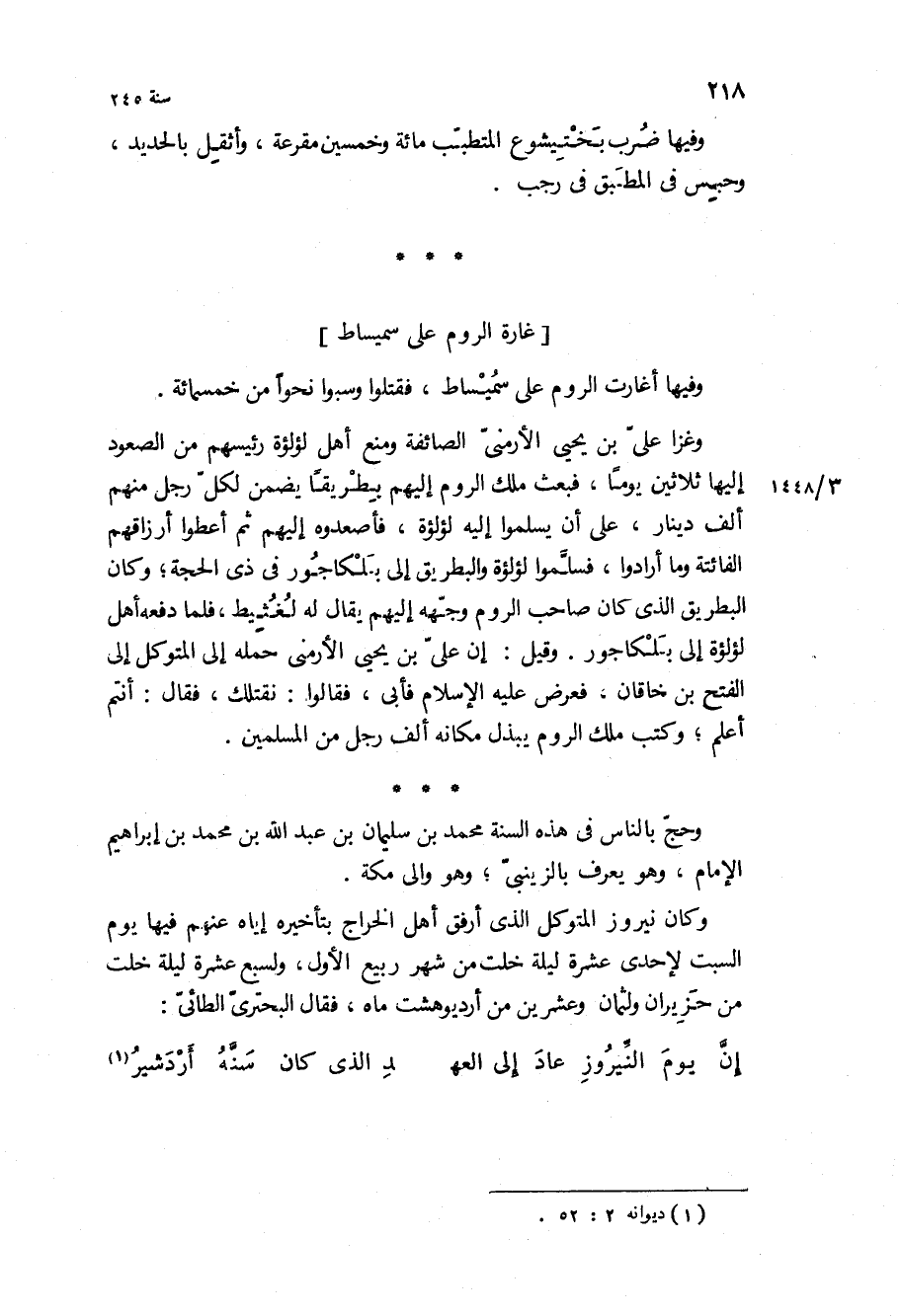 وكان نيروز المتوكل الذي أرفق أهل الخراج بتأخيره إياه عنهم فيها يوم السبت لإحدى عَشْرَةَ لَيْلَةً خَلَتْ مِنْ شَهْرِ رَبِيعٍ الأَوَّلِ، ولسبع عشرة ليلة خلت من حزيران ولثمان وعشرين من أرديوهشت ماه، فقال البحتري الطائي: