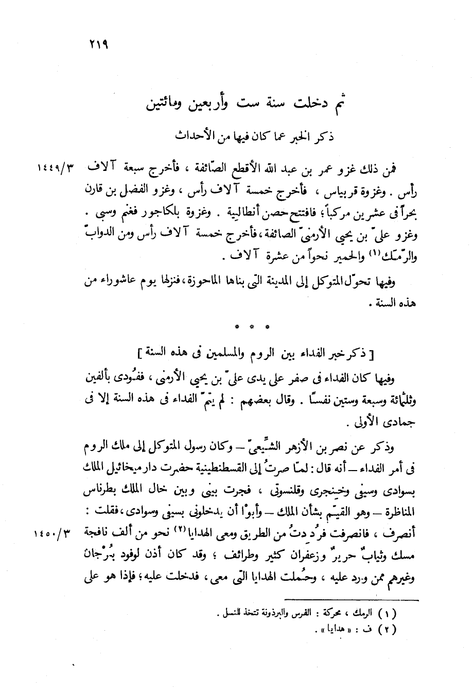 وفيها كان الفداء في صفر على يدي علي بن يحيى الأرمني، ففودي بألفين وثلاثمائة وسبعة وستين نفسا وقال بعضهم: لم يتم الفداء في هذه السنة إلا في جمادى الأولى.