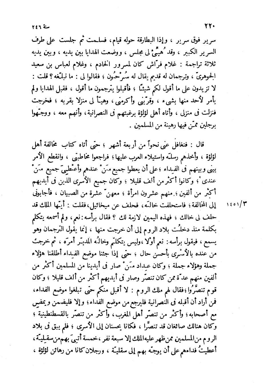 قال: فتغافل عني نحوا من أربعة أشهر، حتى أتاه كتاب مخالفة أهل لؤلؤة، وأخذهم رسله واستيلاء العرب عليها، فراجعوا مخاطبتي، وانقطع الأمر بيني وبينهم في الفداء، على أن يعطوا جميع من عندهم وأعطي جميع من عندي، وكانوا أكثر من ألف قليلا، وكان جميع الأسرى الذين في أيديهم أكثر من ألفين، منهم عشرون امرأة، معهن عشرة من الصبيان، فأجابوني إلى المخالفة، فاستحلفت خاله، فحلف عن ميخائيل، فقلت: أيها الملك قد حلف لي خالك، فهذه اليمين لازمة لك؟ فقال برأسه: نعم، ولم اسمعه يتكلم بكلمة منذ دخلت بلاد الروم إلى أن خرجت منها، إنما يقول الترجمان وهو يسمع، فيقول برأسه: نعم أو لا، وليس يتكلم وخاله المدبر أمره، ثم خرجت من عنده بالأسرى بأحسن حال، حتى إذا جئنا موضع الفداء أطلقنا هؤلاء جملة وهؤلاء جملة، وكان عداد من صار في أيدينا من المسلمين أكثر من ألفين منهم عدة ممن كان تنصر وصار في أيديهم أكثر من ألف قليلا، وكان قوم تنصروا، فقال لهم ملك الروم: لا أقبل منكم حتى تبلغوا موضع الفداء، فمن أراد أن أقبله في النصرانية فليرجع من موضع الفداء، وإلا فليضمن ويمض مع أصحابه، وأكثر من تنصر أهل المغرب، وأكثر من تنصر بالقسطنطينية، وكان هنالك صائغان قد تنصرا، فكانا يحسنان إلى الأسرى، فلم يبق في بلاد الروم من المسلمين ممن ظهر عليه الملك إلا سبعة نفر، خمسة أتي بهم من سقلية، أعطيت فداءهم على أن يوجه بهم الى سقليه، ورجلان كانا من رهائن لؤلؤة،