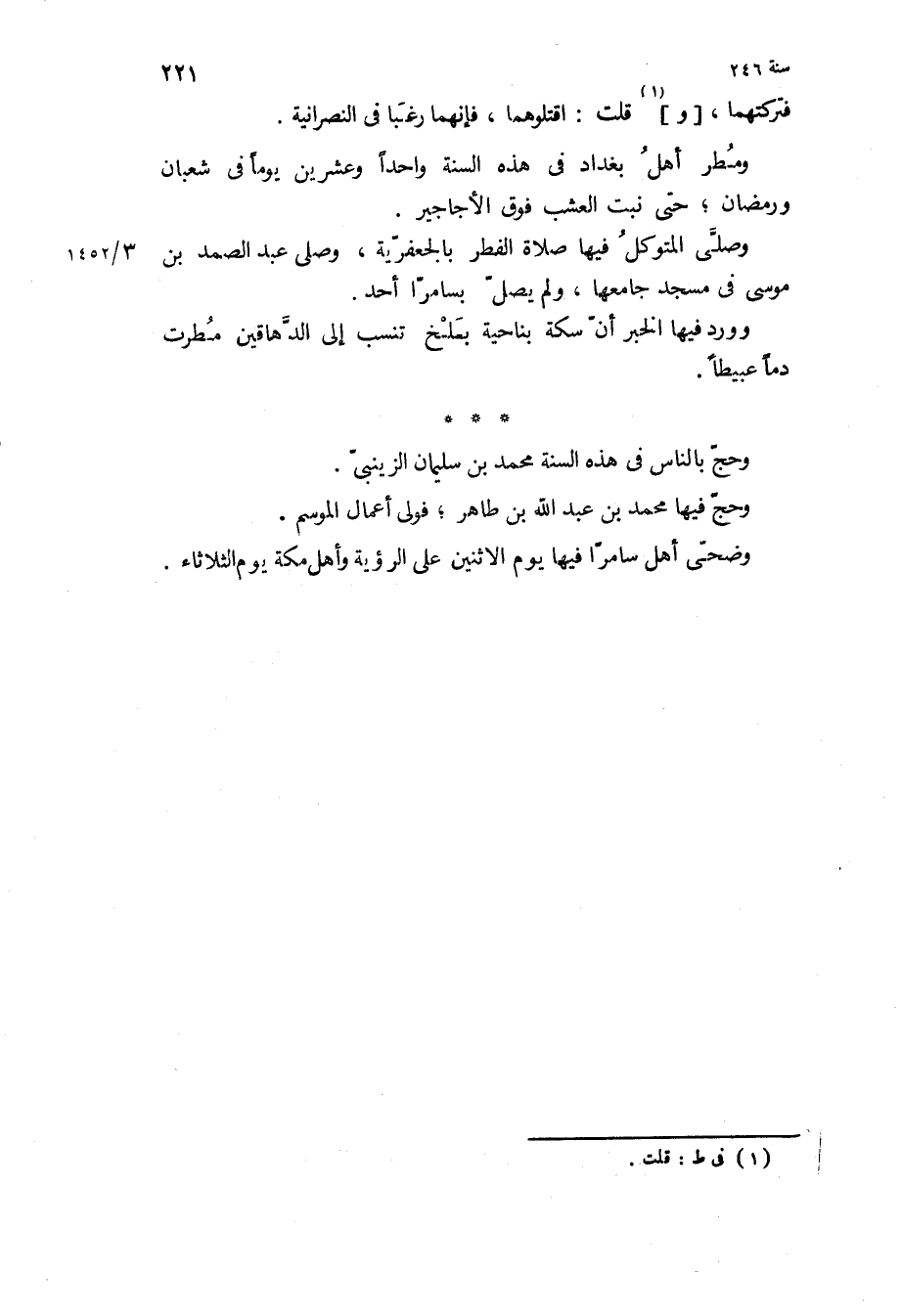 ومطر أهل بغداد في هذه السنة واحدا وعشرين يوما في شعبان ورمضان، حتى نبت العشب فوق الأجاجير.