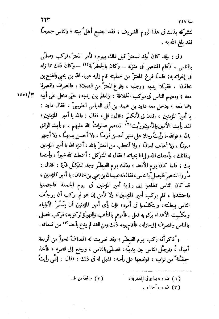 قال: وقد كان ولد للمعتز قبل ذلك بيوم، فأمر المعتز، فركب وصلى بالناس، فأقام المنتصر في منزله- وكان بالجعفرية- وكان ذلك مما زاد في اغرائه به، فلما فرغ المعتز من خطبته قام إليه عبيد الله بن يحيى والفتح بن خاقان، فقبلا يديه ورجليه، وفرغ المعتز من الصلاة، فانصرف وانصرفا معه، ومعهم الناس في موكب الخلافة، والعالم بين يديه، حتى دخل على أبيه وهما معه، ودخل معه داود بن محمد بن أبي العباس الطوسي، فقال داود: