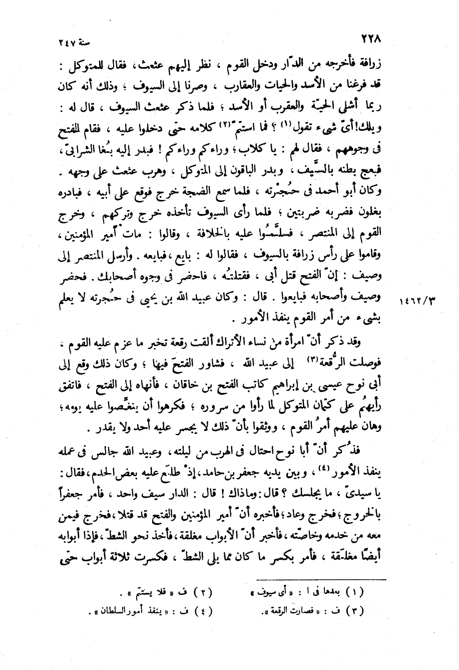 ويلك! أي شيء تقول؟ فما استتم كلامه حتى دخلوا عليه، فقام الفتح في وجوههم، فقال لهم: يا كلاب، وراءكم وراءكم! فبدر إليه بغا الشرابي، فبعج بطنه بالسيف، وبدر الباقون إلى المتوكل، وهرب عثعث على وجهه.