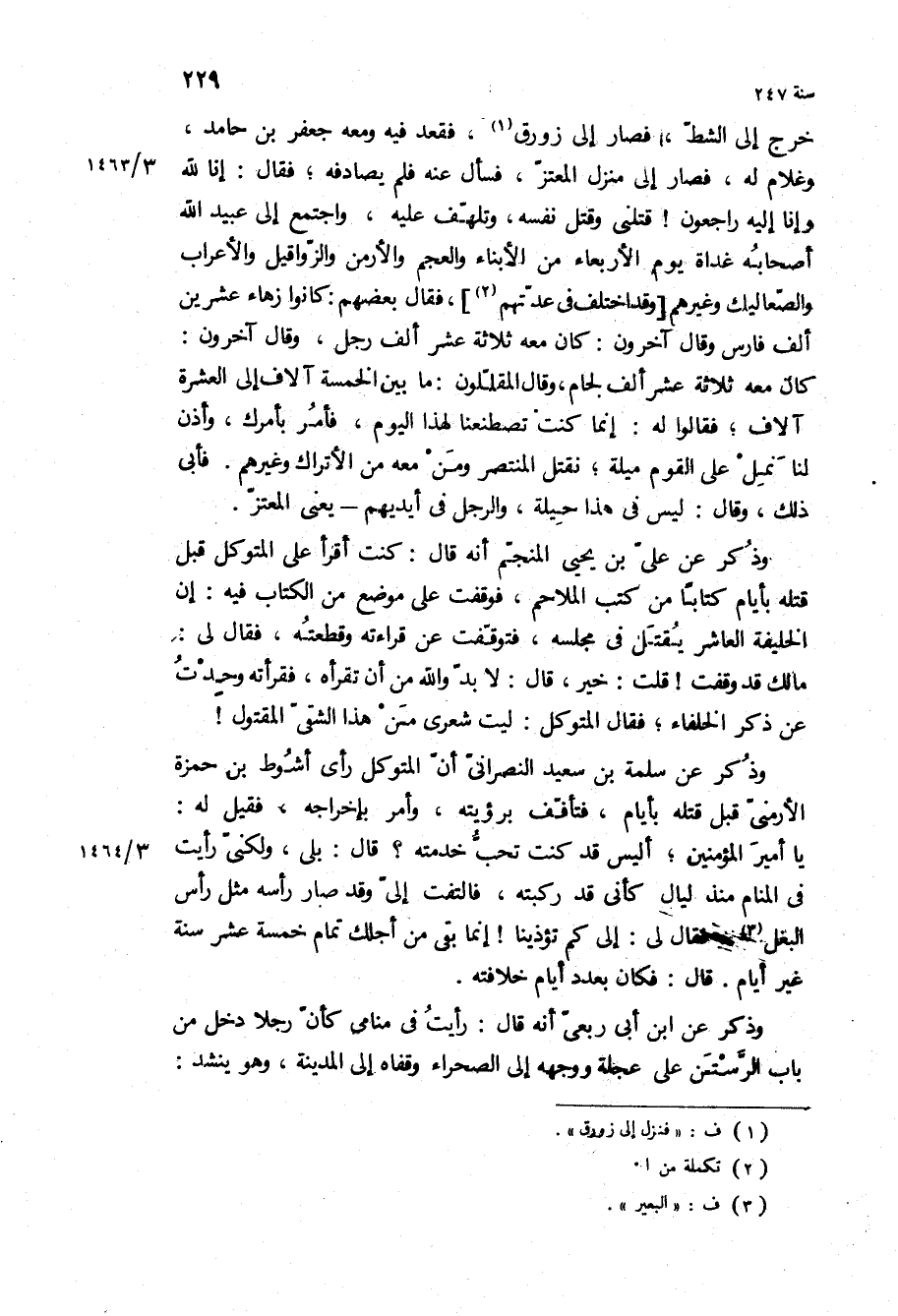 كان معه ثلاثة عشر ألف لجام، وقال المقللون: ما بين الخمسة آلاف إلى العشرة آلاف، فقالوا له: إنما كنت تصطنعنا لهذا اليوم، فأمر بأمرك، وأذن لنا نمل على القوم ميلة، نقتل المنتصر ومن معه من الأتراك وغيرهم فأبى ذلك، وقال: ليس في هذا حيلة، والرجل في أيديهم- يعني المعتز وذكر عن علي بن يحيى المنجم أنه قال: كنت أقرأ على المتوكل قبل قتله بأيام كتابا من كتب الملاحم، فوقفت عن قراءته وقطعته، فقال لي: