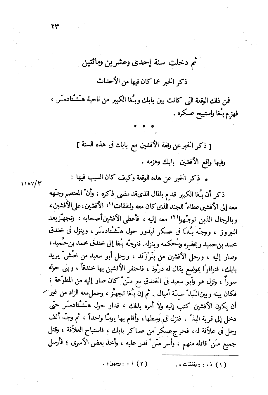 (ذكر الخبر عما كَانَ فِيهَا من الأحداث) فمن ذلك الوقعة التي كانت بين بابك وبغا الكبير من ناحيه هشتاد سر، فهزم بغا واستبيح عسكره.