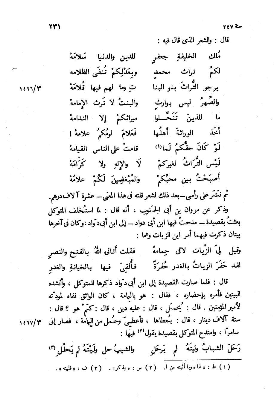 قال: فلما صارت القصيدة إلى ابن ابى دواد ذكرها للمتوكل، وأنشده البيتين فأمره بإحضاره، فقال: هو باليمامة، كان الواثق نفاه لمودته لأمير المؤمنين قال: يحمل، قال: عليه دين، قال: كم هو؟ قال: