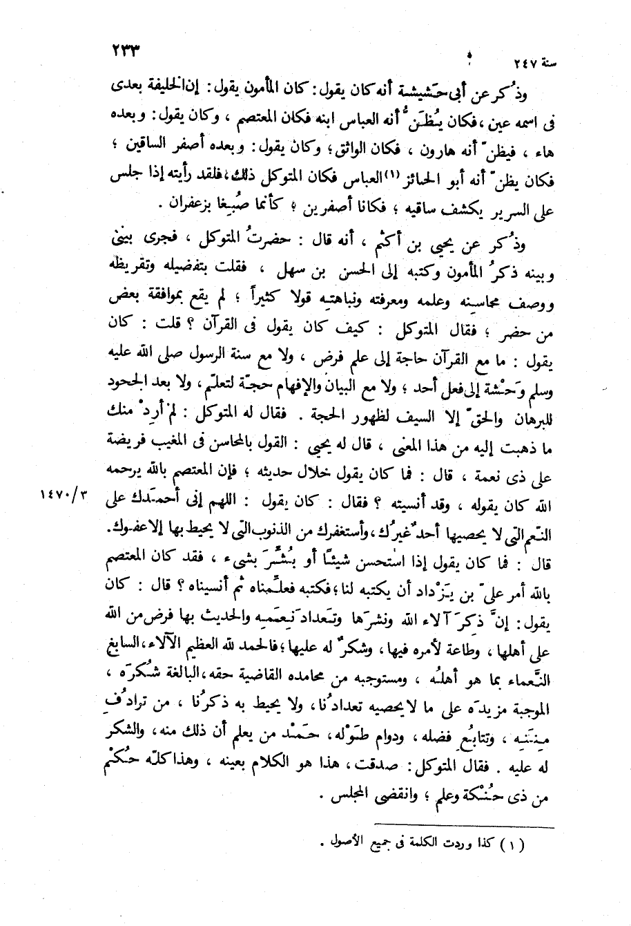 وذكر عن يحيى بن أكثم، أنه قال: حضرت المتوكل، فجرى بيني وبينه ذكر المأمون وكتبه إلى الحسن بن سهل، فقلت بتفضيله وتقريظه ووصف محاسنه وعلمه ومعرفته ونباهته قولا كثيرا، لم يقع بموافقة بعض من حضر، فقال المتوكل: كيف كان يقول في القرآن؟ قلت: كان يقول: ما مع القرآن حاجة إلى علم فرض، ولا مع سنه الرسول ص وحشة إلى فعل أحد، ولا مع البيان والإفهام حجة لتعلم، ولا بعد الجحود للبرهان والحق إلا السيف لظهور الحجة فقال له المتوكل: لم أرد منك ما ذهبت إليه من هذا المعنى، قال له يحيى: القول بالمحاسن في المغيب فريضة على ذي نعمة، قال: فما كان يقول خلال حديثه، فإن المعتصم بالله يرحمه الله كان يقوله، وقد أنسيته؟ فقال: كان يقول: اللهم إني أحمدك على النعم التي لا يحصيها احد غيرك، وأستغفرك من الذنوب التي لا يحيط بها إلا عفوك.